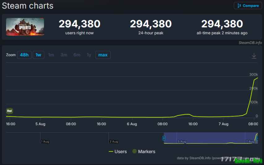 根据SteamDB的数据,在公测开始之际,《战地6》的同时在线玩家数迅速攀升,并突破了10万人的大关,远超预载期间记录下的近2.5万的峰值人数。截止到发稿前,同时在线人数已逼近30万。
