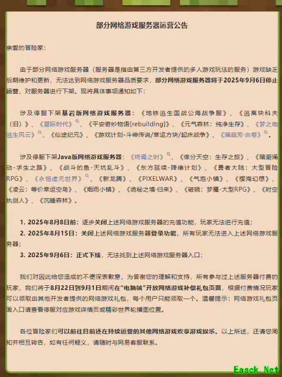 涉及停服下架基岩版网络游戏服务器:《地铁逃生国战公海战争服》、《逃离块科夫(旧)》、《星际时代》、《平安奇妙物语 [rebuilding]》、《元气森林:纯净生存》、《梦之地逃生风云》、《仙途纪元》、《游戏计划-斗神传说 / 幸运方块 / 起床战争》、《满庭芳・古卷》。 涉及停服下架 Java 版网络游戏服务器:《终焉之时》、《缘分天空:生存之旅》、《暗潮涌动-求生之路》、《战斗的鱼-天坑乱斗》、《东方延续-降维计划》、《勇者大陆:大型冒险 RPG》、《永恒虚无世界》、《新龙腾》、《PIXELWAR》、《气泡小镇》、《樱海幻想》、《凌云:等价幸运空岛》、《烟雨小镇》、《诡秘之境・归来》、《破晓:梦魇-大型 RPG》、《时空执剑人》、《沉睡森林》。 进程如下: 2025 年 8 月 8 日前:逐步关闭上述网络游戏服务器的充值功能,玩家无法进行充值; 2025 年 8 月 15 日:关闭上述网络游戏服务器登录功能,所有玩家无法进入上述网络游戏服务器; 2025 年 9 月 6 日:正式下线,无法找到上述网络游戏服务器入口; 公告称:“我们对因此给您造成的不便深表歉意,为答谢您的理解和支持,所有参与过上述服务器付费的玩家,我们将于 8 月 22 日到 9 月 1 日期间在“电脑端”开放网络游戏补偿礼包页面,根据付费情况玩家可以领取由其他开发者提供的网络游戏礼包,每个用户只能领取一个。温馨提示:网络游戏礼包页面入口请查看停服对应游戏详情页或精彩世界轮播图位置。” 更多相关资讯请关注:我的世界专区 |