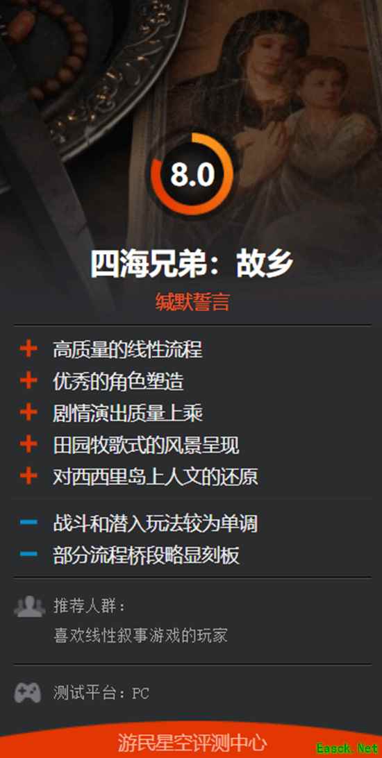 《四海兄弟》系列最新作品《四海兄弟:故乡》即将于8月8日发售,在游民商城购买《四海兄弟:故乡》,可叠加金币抵扣,标准版仅需¥197.1 (原价¥219),豪华版仅需¥241.2 (原价¥268)。 截止至发稿时,本作在Metacritic评分网站上的媒体均分为76分。目前共有31家媒体给出评测,其中20家媒体给出好评,其他8家媒体给予中评,好评率为71%。 其中IGN德国给出了90分的高分,认为《四海兄弟:故乡》完美诠释了“整体大于部分之和”。游戏的单个元素或许并不突出,但在这个精美的“拟开放世界”框架下组合起来,依然成就了一部精彩绝伦的作品。诚然,它确实有些不足,但如果你渴望体验精彩的角色、有趣的玩法以及恢弘的场面(当然还有美丽的风景!),那么你绝对应该去西西里岛旅行。 而Stevivor仅给出了50分的评价,认为《四海兄弟:故乡》从视觉效果来看堪称惊艳之作,但游戏玩法只能说平庸,谈不上是好玩。其游戏剧情本身就是一场悲剧——乏味、线性,充斥着各种套路,毫无新意可言。角色都是刻板的老套形象,仅此而已。 此外,我站给予了《四海兄弟:故乡》8.0分的评价,认为本作的玩法设计算不上出色,整体节奏在这个快餐化的年代也有些缓慢。但如果你愿意放下对“开放世界”、“高度可玩性”、“自由探索”等现代标签的期待,只是想沉浸式地体验一场发生在黑手党发源地的,关乎家族、信念与爱的往事,那它确实也有其体验独到之处。详情请移步:《四海兄弟:故乡》游民评测8.0分 此心安处是吾乡>>> 本文由制作发布,未经允许禁止转载。 更多相关资讯请关注:四海兄弟:故乡专区 |