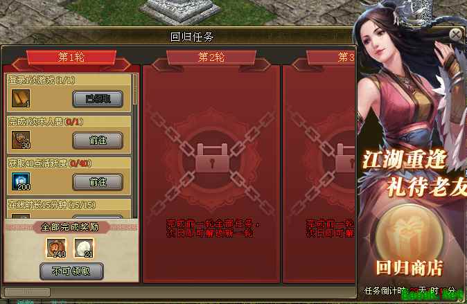 福利二:15 天回归任务,每日领奖轻松提升 领取回归礼包后,大侠将解锁为期15天的专属回归任务,大侠只要动动手指完成简单的日常任务,即可领取名侠简录、优良装备碎片宝箱、经脉礼包、辉煌之果等高价值奖励。累计完成全部任务,更可额外获得2100个回归玉符、315个白月玉等重要材料,助力快速提升经脉、挂饰等级,快速追赶江湖大部队。