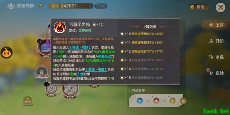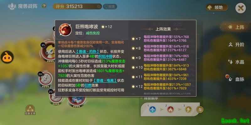 继续了解巨熊的技能机制与关键参数。 变身最长持续时间为四秒钟。 技能特点:减少伤害,免疫控制。 技能并未具体说明减伤方式,是否指魔兽自带的80%减伤效果,还是其他机制,这点尚不明确。 对敏锐系魔兽目标施加5秒引燃,附加流血效果。 技能机制:长按可进入持续4秒的滚动冲锋状态,并在冲锋结束或提前松手时触发范围震荡波伤害;若未长按则直接释放震荡波攻击。 运用建议: 现阶段指望巨熊冲锋打输出并不现实,其技能主要定位是减伤与免控效果。不过减伤机制并未明确说明具体方式,如果只是类似魔兽自带的80%减伤,那实际意义不大,毕竟大部分魔兽本身就有该效果。而免控则是狂野系魔兽的通用被动,像毛草团也同样具备这一特性。 目前阶段,在这种情况下,狂野系魔兽使用毛草团不仅具备巨熊的效果,还多出一个快速指向性位移技能,综合表现更优秀,因此建议狂野系魔兽优先选择毛草团。 |
