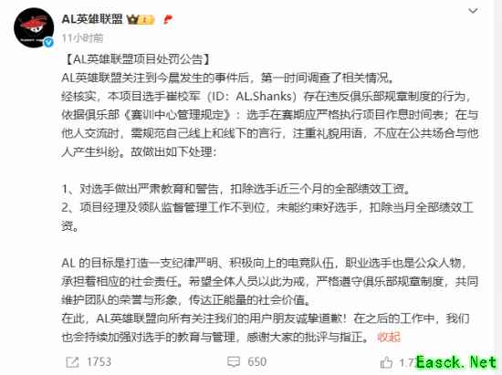 今日凌晨,AL战队发布问题公告,宣布扣除Shanks三个月内全部绩效工资;项目经理、领队监督管理不到位,扣除当月绩效工资。同时向网友、粉丝、观众致歉。