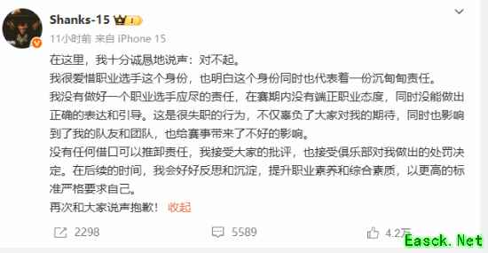此外,Shanks本人也在微博致歉,承认自己没有端正职业态度,辜负了队友和团队,接受大家的批评以及俱乐部处罚,将好好反省。