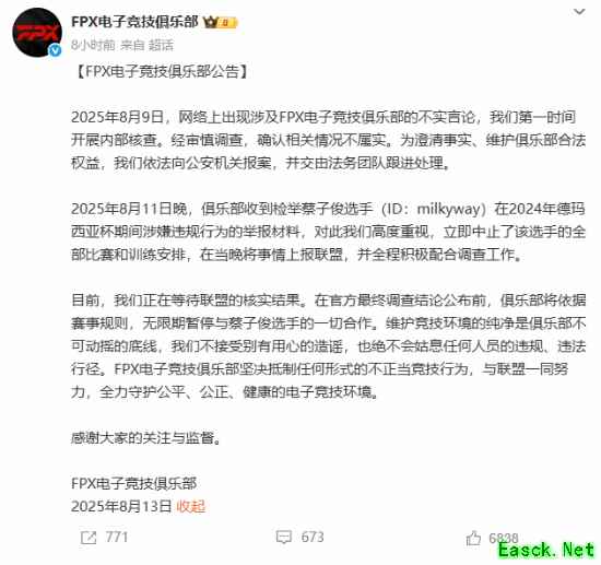 今日,FPX电子竞技俱乐部官方发文宣布,近日俱乐部收到检举《英雄联盟》分部蔡子俊选手(ID:milkyway)在2024年德玛西亚杯期间涉嫌违规行为的举报材料,目前已立即中止了该选手的全部比赛和训练安排,在当晚将事情上报联盟,并全程积极配合调查工作。 官方承诺,在官方最终调查结论公布前,俱乐部将依据赛事规则,无限期暂停与蔡子俊选手的一切合作。“维护竞技环境的纯净是俱乐部不可动摇的底线,我们不接受别有用心的造谣,也绝不会姑息任何人员的违规、违法行径。FPX电子竞技俱乐部坚决抵制任何形式的不正当竞技行为,与联盟一同努力,全力守护公平、公正、健康的电子竞技环境。”