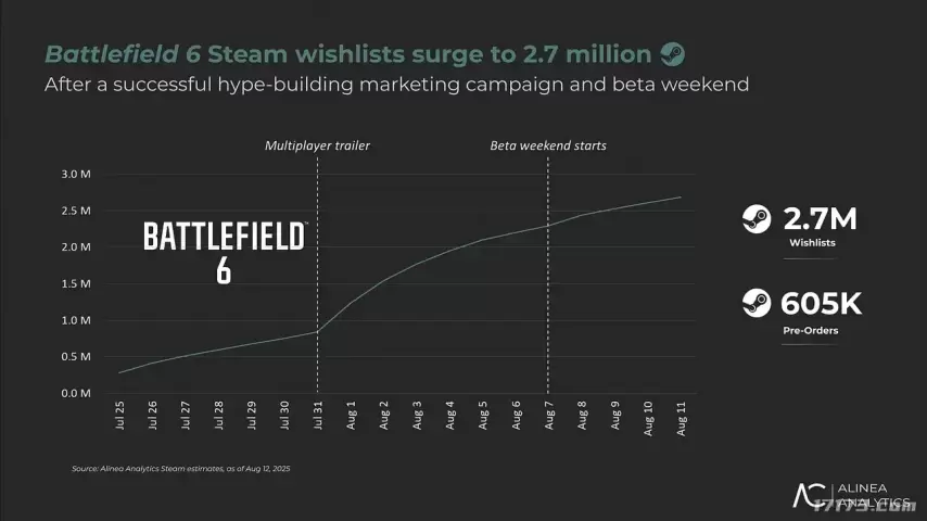 在经历了前作《战地2042》的市场失利之后,《战地6》终于迎来了它的复兴时刻。这款由EA旗下DICE工作室领衔开发,并集结了Criterion、Motive等多个顶尖团队共同打造的现代战争射击大作,在Steam平台上公测首周便创下了超过52万玩家同时在线的新纪录。 不仅如此,根据游戏市调机构Alinea Analytics提供的数据,本作在Steam平台上的预购量已经突破了60万套,预计带来了约3,500万美元的营收。 值得注意的是,《战地6》不仅吸引了系列的老粉丝回归,同时也成功从其主要竞争对手《使命召唤》系列中挖走了不少玩家。数据显示,有高达62%的《战地6》Steam愿望清单用户同时也是《使命召唤》系列的玩家,这一比例甚至高于曾经玩过2021年版《战地2042》的48%玩家比例。 为了挽回因《战地2042》而受损的品牌形象,EA将《战地》这个IP交给了射击游戏界的传奇人物Vince Zampella来掌舵。在他的领导下,《战地6》重新引入了深受玩家喜爱的职业系统,并对场景破坏机制进行了优化,力求让游戏体验更加贴近系列黄金时代的《战地3》和《战地4》。此外,本作还重启了单人战役模式,进一步丰富了游戏的内容和玩法。 自7月31日公开多人游戏预告片以来,《战地6》的Steam愿望清单数量迅速从大约75.4万增加到了123万,一天内增长了62%。而在8月7日开始的第一轮多人模式测试周末期间,愿望清单的增长速度更是达到了每天约30万条新增记录。随着第二轮公开测试的临近,《战地6》的销售势头依然强劲,EA的股价也因此创下历史新高。 随着10月10日正式发售日期的临近,《战地6》已经在销售和声量上展现出了强大的竞争力。考虑到这款游戏在Beta测试阶段所展现出的良好表现及其对市场的吸引力,它有望成为近年来该系列最为成功的首发作品之一。 |