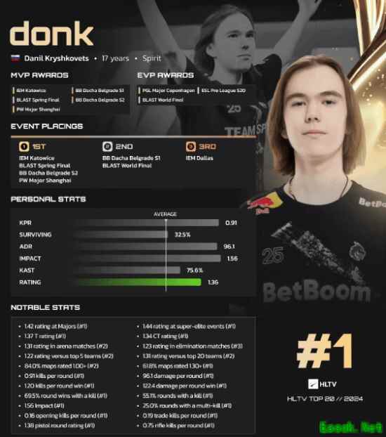 近年来,在《CS2》竞技舞台上,俄罗斯天才选手donk横空出世,仅用两年时间就取得了许多电竞选手职业生涯都难以企及的成就。其本人也凭借独特的风格,收获了无数粉丝。