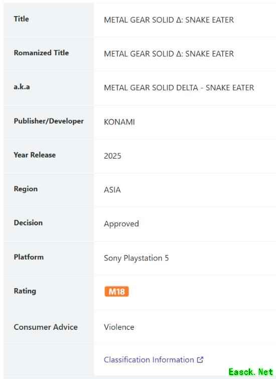 《合金装备3:重制版》获M18评级!原作内容保留