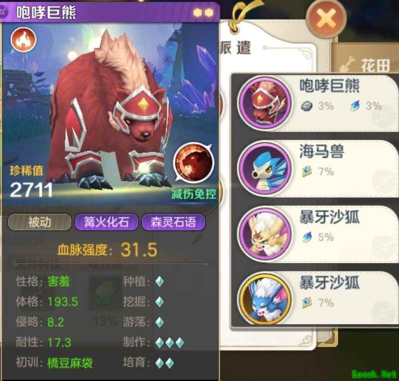 毕业档七彩词条极为稀有,仅异色闪光与巨型异色闪光精灵有机会出现,其中异色闪光获取概率极低,巨型异色更是难以获得,因此七彩词条目前基本属于偶然才能遇到的状态。 在魔兽领地中,三大资源获取地可派遣多只生活魔兽采集资源。生活魔兽自带的资源获取几率是叠加的,因此在同一资源获取地中,魔兽附带的资源种类越多,采集进度和效率就越高。 对于达不到战斗和生活品质要求的多余魔兽,可用于熔炼获取血脉。平时遇到闪光或异色魔兽要尽量捕捉。平民玩家可通过大量收集魔兽来提升词条质量。随着领地等级提升,可派遣的生活魔兽数量也会增加,而它们的品质直接关系到资源获取效率。从长远角度看,生活魔兽的重要性甚至超过战斗魔兽。 |