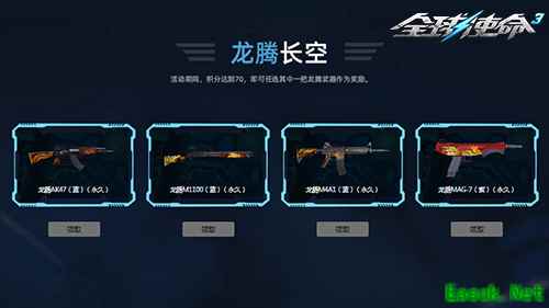 龙腾长空:永久枪械免费领,收藏战力双提升 当玩家积分累积至70分,即可解锁本次活动的终极奖励——龙腾系列4把永久枪械中的任意一把!龙腾AK47(蓝)(永久)以高稳定性和精准度著称,适合中远距离压制;龙腾M1100(蓝)(永久)则是霰弹枪中的佼佼者,近战爆发无人能敌;龙腾M4A1(蓝)(永久)兼顾射速与伤害,是全能型战士的首选;龙腾MAG-7(紫)(永久)则以独特的外观和实用性能吸引收藏爱好者。四把武器不仅能为枪械装置屋增添稀有藏品,更能在实战中发挥关键作用,助玩家轻松制霸战场!