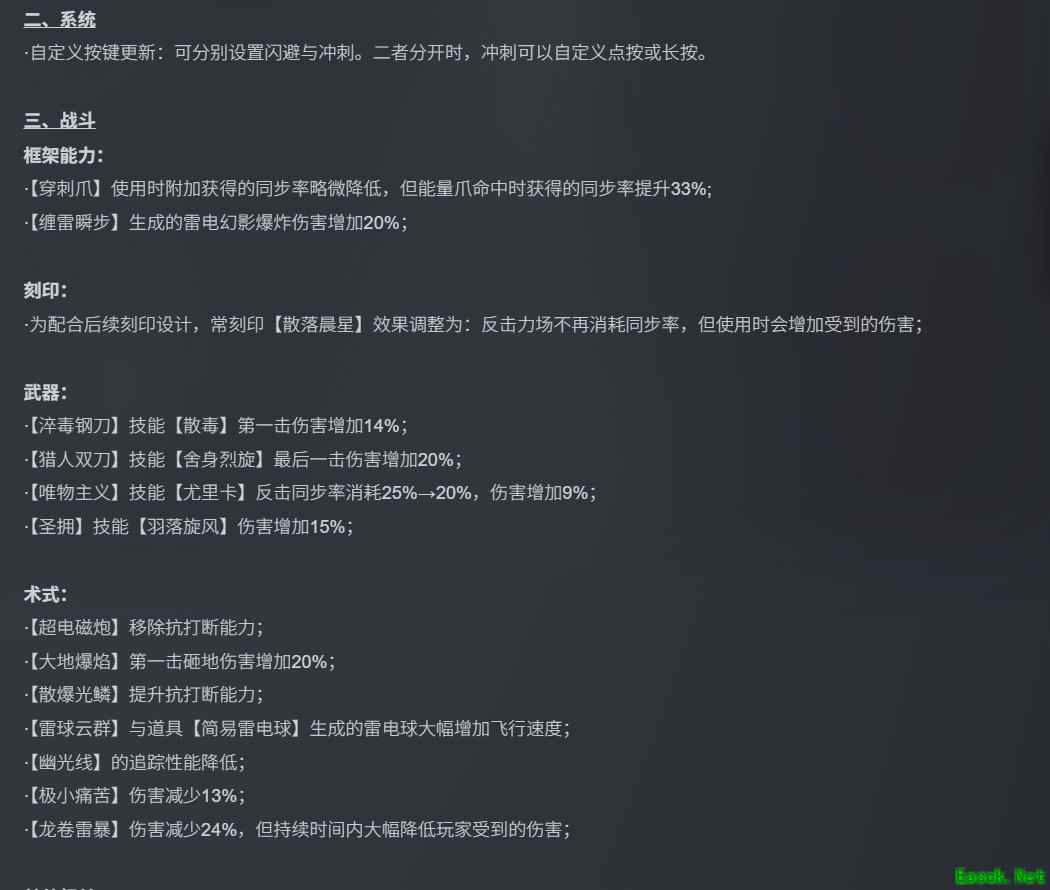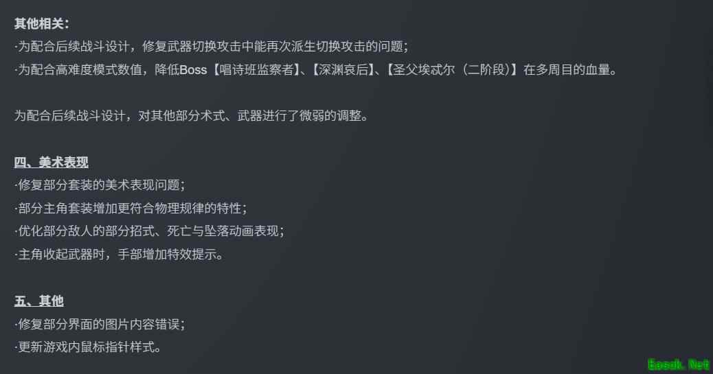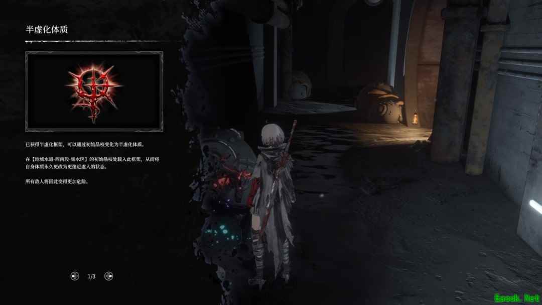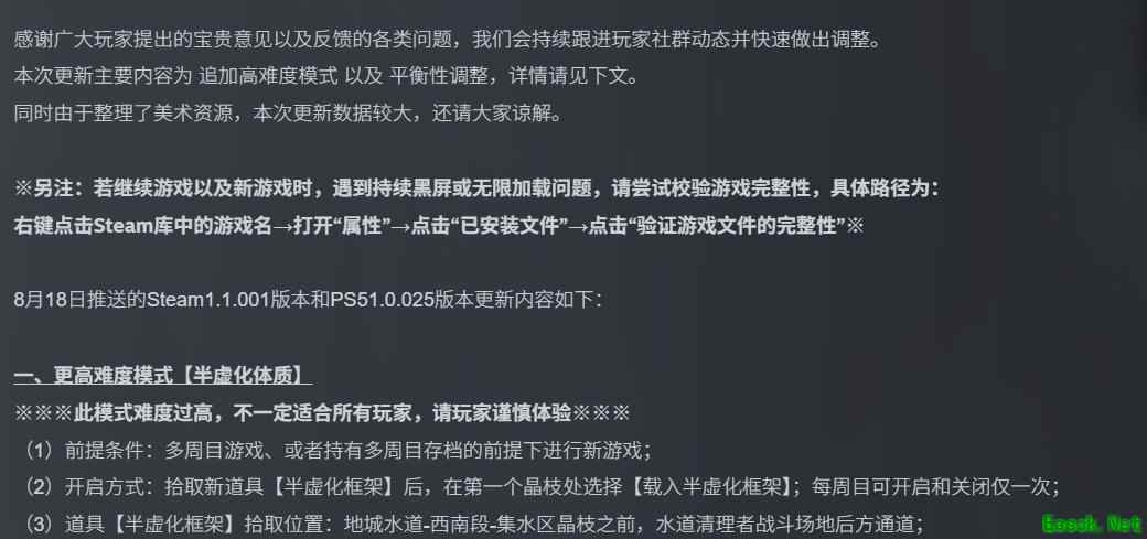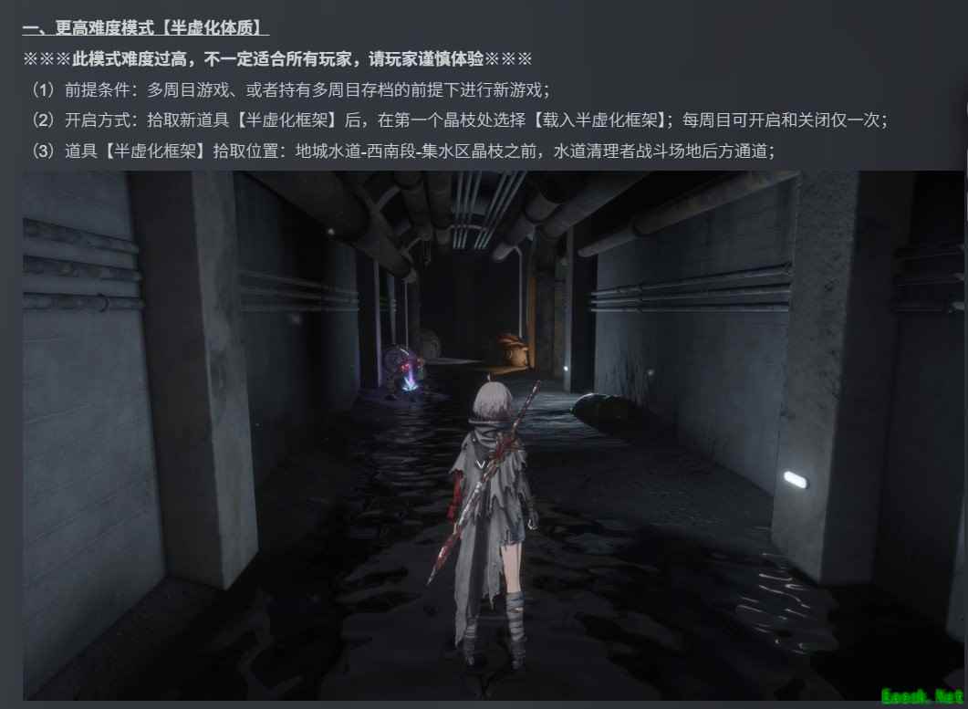 本次更新新增了更高难度模式【半虚化体质】。和魂游相同,本作也有通关后继承属性进行多周目的机制,而本次更高难度面向的正是那些历经多周目战斗、已感觉不到敌人威胁的老练玩家准备的高难度模式。开启方式是通过拾取游戏序章“地城水道-西南段-集水区晶枝”之前,水道清理者战斗场地后方通道处的“半虚化框架”开启的,拾取道具后需在第一个晶枝处选择【载入半虚化框架】;每周目可开启和关闭仅一次。