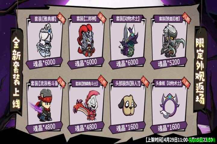 联动套装闪亮登场,更有超多限定套装返场! 联动套装上新,还有更多限定返场套装等你兑换! 全新联动套装二郎神、雅典娜上架,售价6000魂晶。此外,更有往期活动外观轮换返场,宝藏猎人们不要错过啦,请及时兑换喜欢的外观吧!