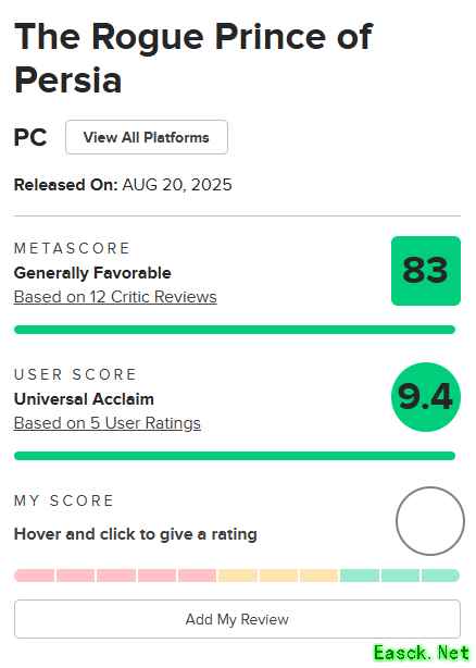 由育碧发行,Evil Empire打造的动作肉鸽游戏《波斯王子:Rogue》已于8月20日正式发售。截至目前知名游戏评测网站Metacritic共收录12家媒体测评,均分83。