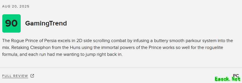 部分媒体测评:GamingTrend 90分: 《波斯王子:Rogue》在2D横版战斗中表现出色,通过将流畅的跑酷系统融入其中,增添了不少亮点。每一次游戏体验都让我迫不及待想要立即重新开始。