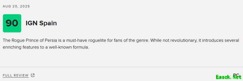 IGN Spain 90分: 《波斯王子:Rogue》是roguelite类型爱好者必备的游戏。虽然它并不具备革命性创新,但它为这一广为人知的游戏模式引入了若干丰富的特色。
