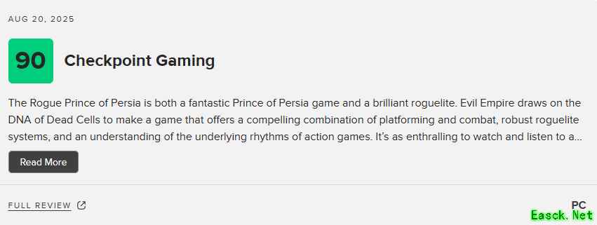 Checkpoint Gaming 90分: 《波斯王子:Rogue》既是一款精彩的《波斯王子》游戏,也是一个出色的roguelite作品。游戏汲取了《死细胞》的精髓,打造了一款将平台跳跃与战斗、强大的roguelite系统以及对动作游戏节奏的深刻理解相结合的游戏。