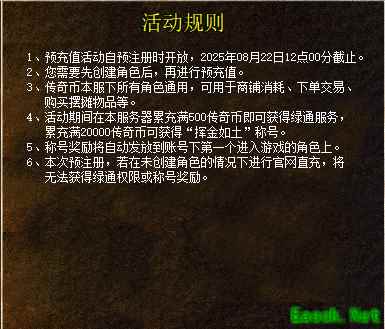 (二)绿通服务说明 方式1:活动期间,在“皓月[散人专区]”服务器累计“预充值”达到500传奇币的游戏账号,将解锁该服的“绿通”服务,享受优先进服权。在“皓月[散人专区]”服务器,同账号下所有角色都可以享受“绿通”服务,其他服务器不能享受绿通服务。 方式2:如果玩家错过预充值活动而未能获取绿通服务,仍可在“皓月[散人专区]”正式开服后,在游戏内累计充值满2000传奇币(含预充值)来获取绿通资格(截止9月21日24点前)。 注意事项: (1) 累计充值数据统计可能略有延迟,我们将在1个工作日内为符合条件的玩家添加绿通服务。 (2) 游戏内元宝兑换传奇币不计算在内。 (三)“挥金如土”称号 活动期间,在“皓月[散人专区]”服务器累计“预充值”达到20000传奇币的游戏账号,将获得且仅可获得1次“挥金如土”称号。该称号将自动发放给该充值账号下第一个进入服务器的角色。