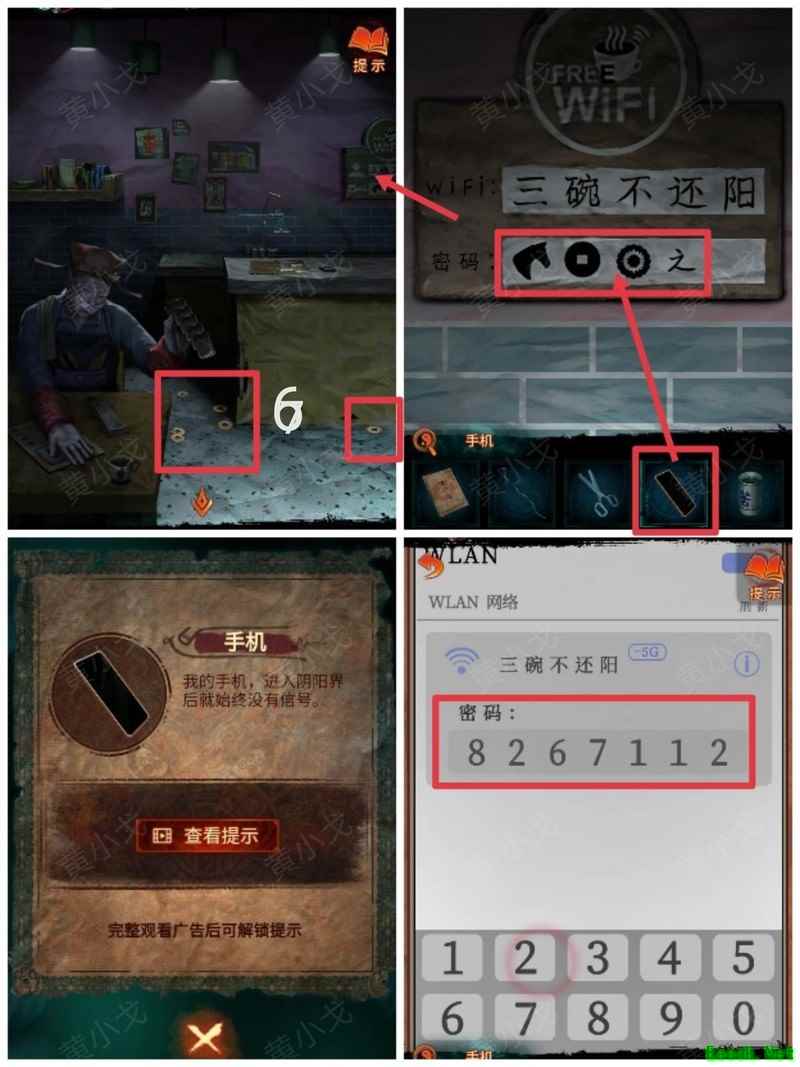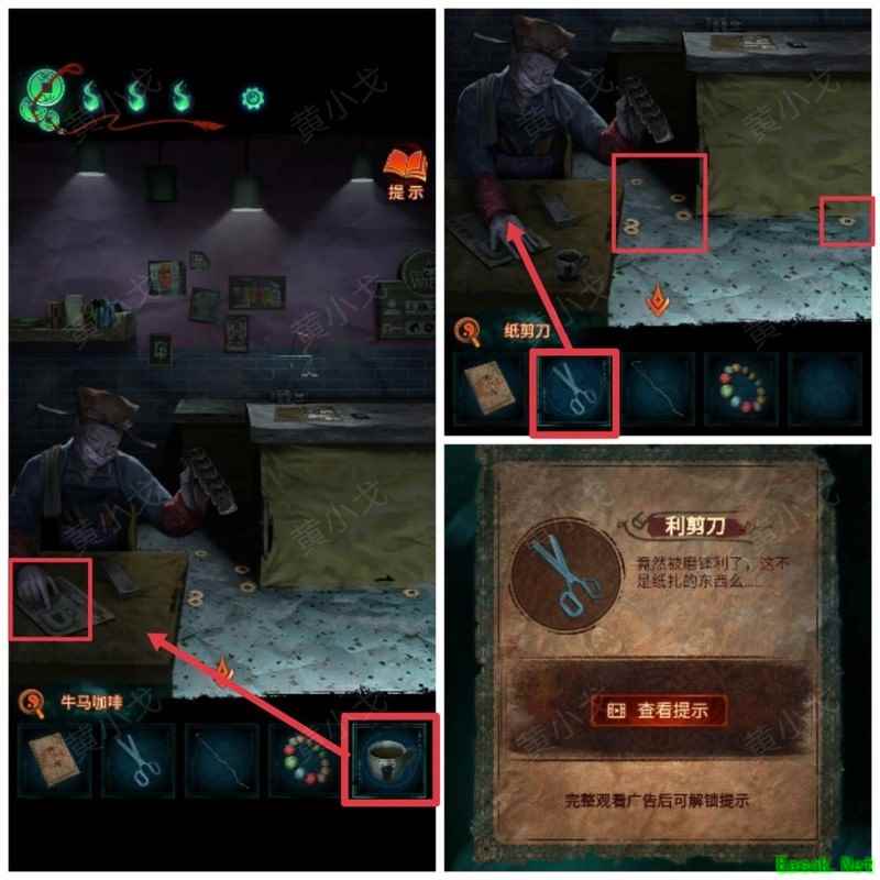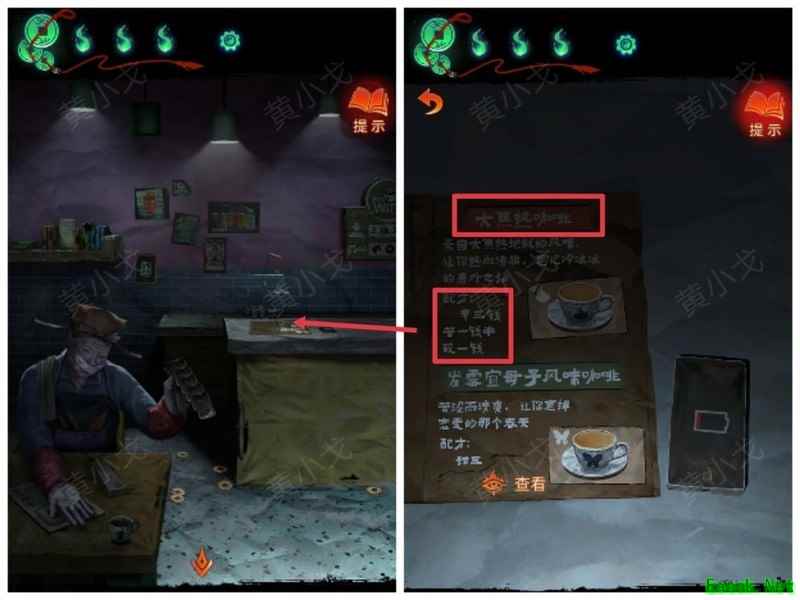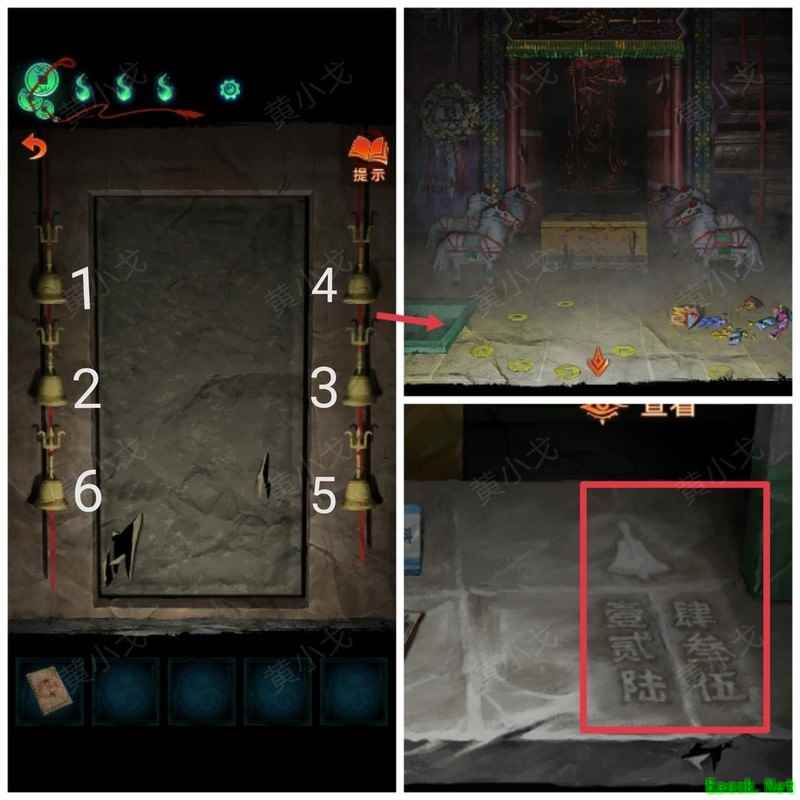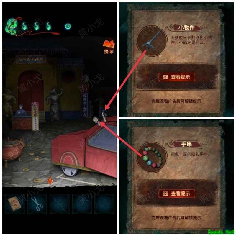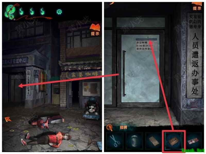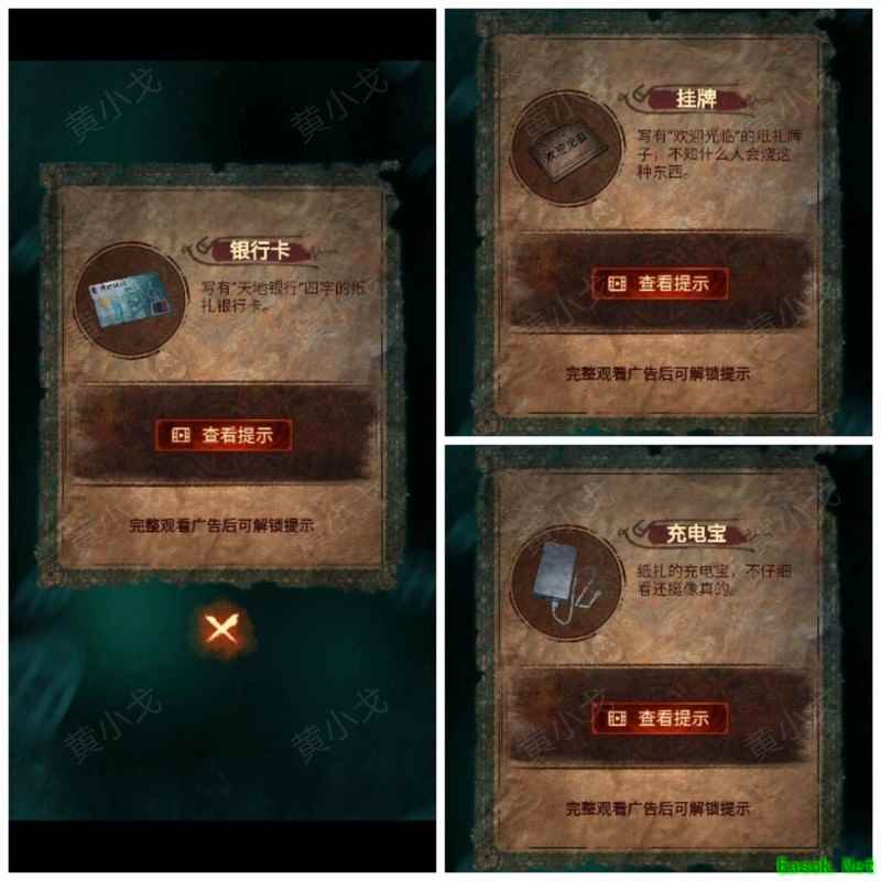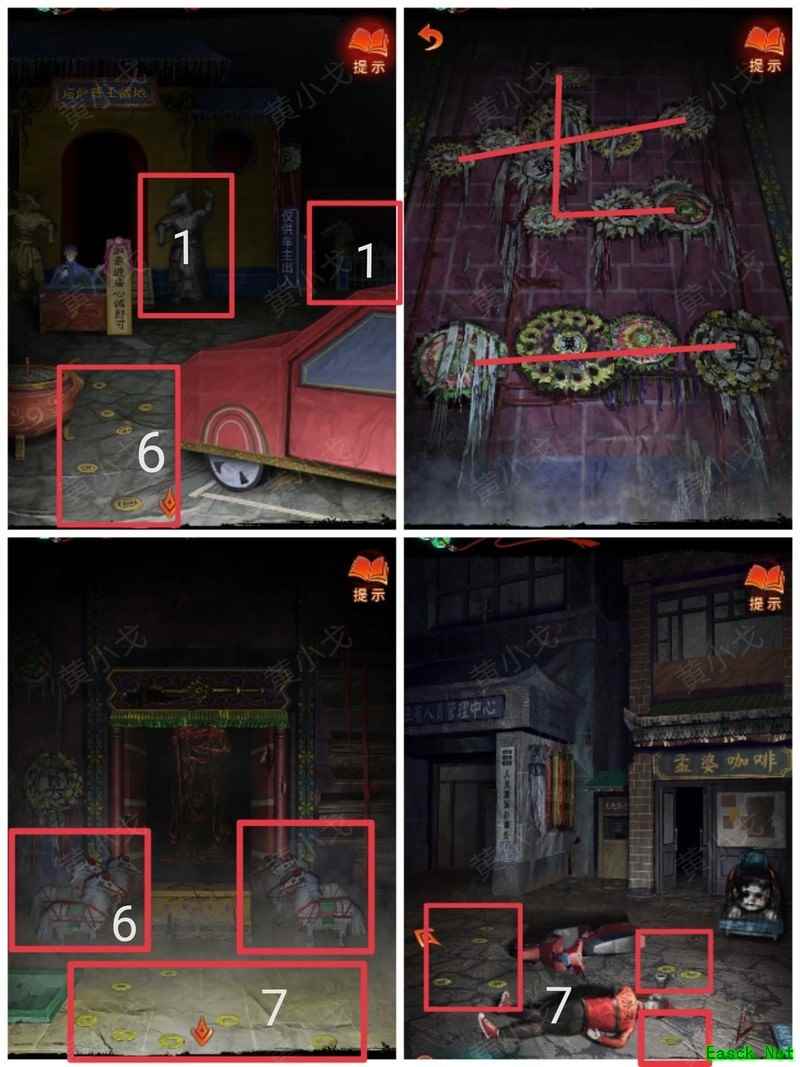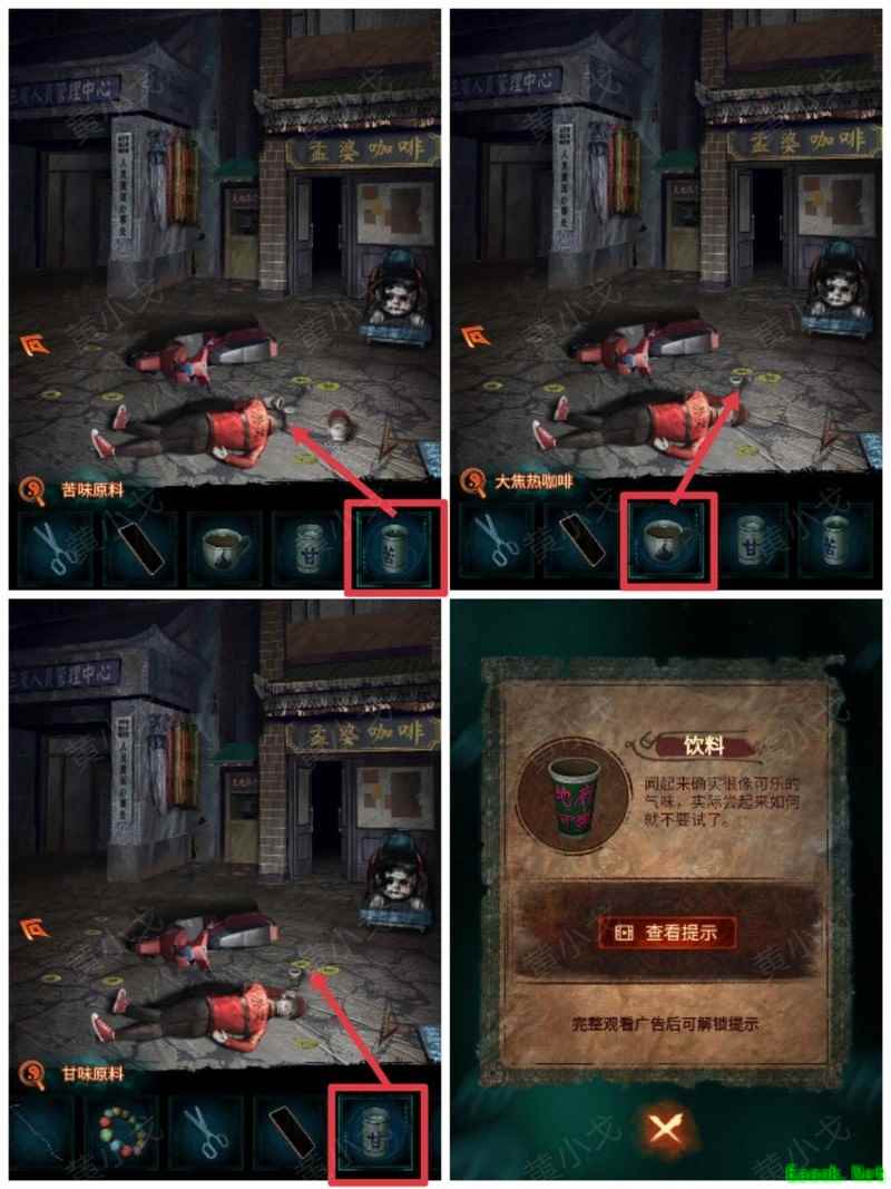 纸嫁衣7卿不负第三章攻略来啦!本章剧情紧凑、谜题烧脑,从咖啡店到庙宇,从纸人手中获取道具到破解密码,每一步都需细心观察。掌握关键线索,顺利通关第三章,快来看看详细步骤吧!攻略 纸嫁衣7卿不负 第一章|第二章|第三章 第四章与第五章内容 第三章:听妄 (咖啡店外)观察门上图案,留意地面纸钱共7张。 (庙外)查看纸保安手机(注意地上纸钱:6张) 点击查看马面手中武器,留意牌子图案与位置。 点击牛头手中的武器,参照咖啡店门上的图案及其位置,再结合马面武器上牌子的图案和位置,调整牌子的位置。 触发机关后,从牛头手中取得,从马面手中取得。 将粗香插入香炉,点击香炉拜三下,得到铁丝。 在咖啡店外,点击摇摇车,用铁丝钩住投币口,打开盖子,取得车钥匙。 用开启庙外停车场大门;完成华容道小游戏,将红色车辆驶出。 在纸人手中取得小物件与手串。 (咖啡店外)点击门,使用解锁上方锁具。 推开咖啡店门,触发剧情,获得。 将交给八不郎,再把放他手中,请他帮忙磨成。注意地上有6张纸钱。 查看书架上的书,注意之字出现次数减一。 点击柜子查看菜单,记住大蕉热咖啡配方:辛三钱、苦一钱半、酸一钱。 点击秤后,按照菜单配方(辛三钱、苦一钱半、酸一钱),依次倒入两杯辛、一杯半苦和半杯酸。注意每种材料的重量比例:一杯辛为1.5,一杯苦为1,一杯酸为2。 获得大蕉热咖啡、甘味原料和苦味原料。 (咖啡店外)将倒在断头外卖员处,再将与倒入杯中,制成。 (庙外)将饮料递给保安 点击查看墙上花圈排列成的七一字样,注意地面纸钱7张、纸马6匹。 点击桌子,放置手串;依照无字谶图案调整红珠位置,得到经文。 在咖啡店点击WIFI密码牌,可得到一部。随后取出,依据提示内容(马、纸钱、花圈、之),正确输入密码8267112即可。 纸马:庙内6张,庙外1张,马面算1张,共计8张。 纸钱在庙里7张、庙外6张、咖啡店外7张、店内6张,总计26张。 花圈排列成七一字样,悬于庙墙之上。 书中之字共出现12次,更新后的密码为8267212。 进入直播间购物,前往地葬罗王菩萨庙,完成俄罗斯方块小游戏。 通关游戏后可获得银行卡、挂牌和充电宝三件物品。 在咖啡店外,使用天地银行自助机,插入银行卡,领取一叠冥币。 在咖啡店柜台发现手机,用充电宝充电后解锁,获取关键线索。 在咖啡店外,点击办事处门,安装挂牌后开门。 点击桌子上的黄裱纸,使用利剪刀。 根据手机上的图案完成裁剪小游戏,所需材料为无常喜纸钱,可在窗口自助办理说明处获取,完成后可获得。 点击柜子,用铁丝勾出里面的法器。 点击八不郎,用一叠冥币换取空白冥籍。 在咖啡店点击墙上相框,先用法器拧开梅花螺丝,再用利剪刀拧开一字螺丝,取得照片。 完成庙剧情后,成功躲避鬼手小游戏。 将空白冥籍涂抹苦味原料,贴上照片并加盖印章,最终获得冥籍。 点击窗口,提交、和,获取线索(铃铛图案、左-壹二陆、右-肆叁伍)。 点击通往地下室的楼梯,根据办事处窗口获得的铃铛图案线索,按照左壹贰陆、右肆叁伍的顺序点击铃铛,依次触发后打开石门。 |