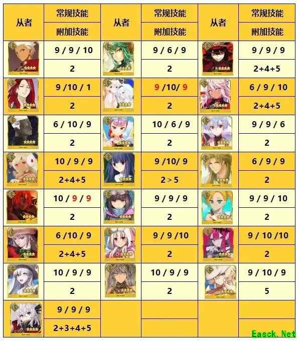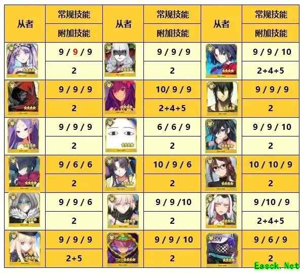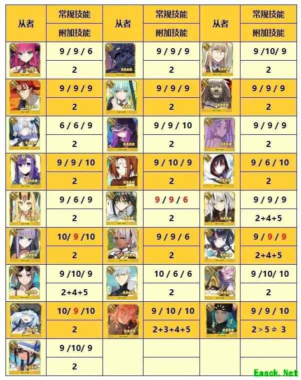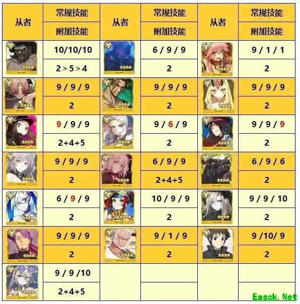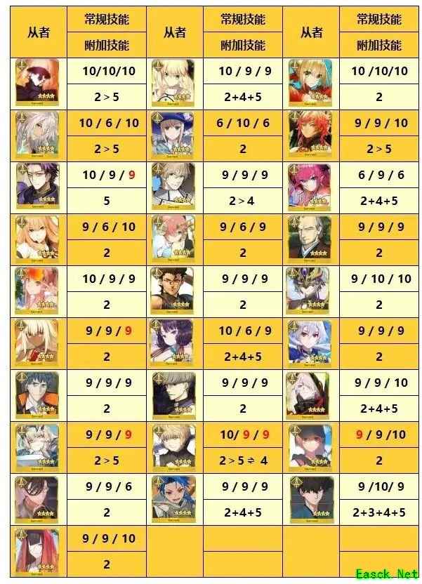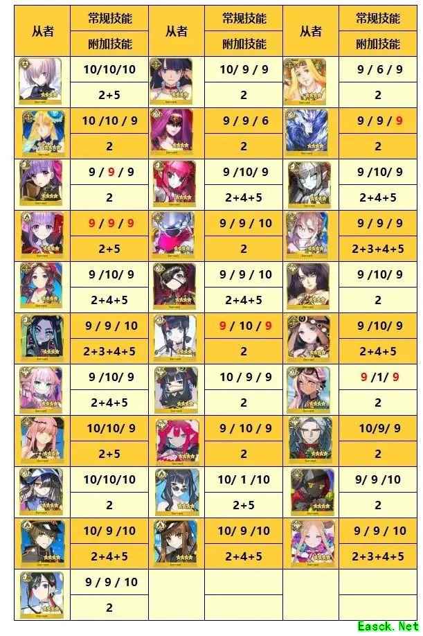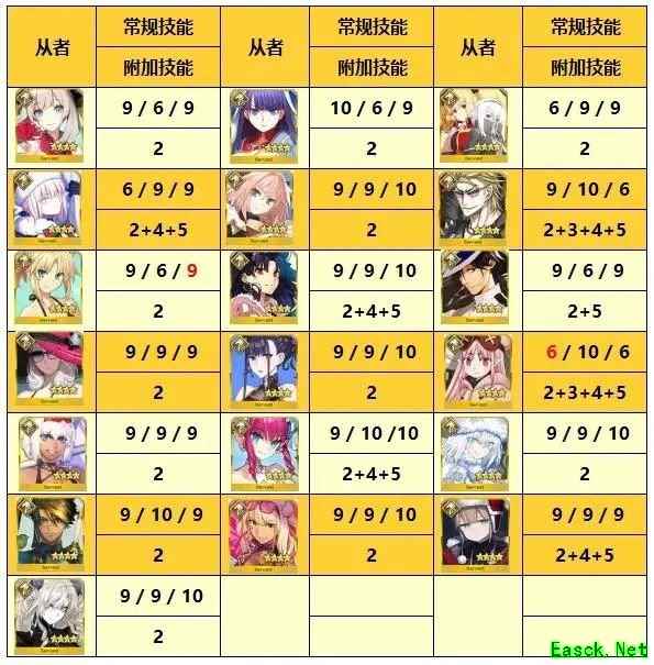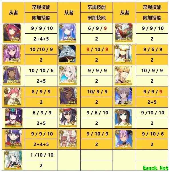 国服在9周年也实装了追加4和5技能,这对于五星从者来说算是比较有优势的技能,但是对于四星从者来说,虽然牵绊的从者币提升了,能开的追加技能依旧很有限。 限定四星从者需要5宝/4宝7绊/3宝9绊/2宝11绊才能开2个追加技能,常驻四星则需要8宝/5宝9绊/3宝11绊才能开2个追加技能。 所以这里的追加技能会比较保守,基本除了活动从者之外,其他都是预留1个,为了后续可能会用到的用法,大家也尽可能留2个追加技能的从者币,以便后续的强化或新体系或许有新的用法。 免费四星基本都可以满从者币,可以优先开启2和5,如果追加3刚好能克制,或者是跟自身职阶相同用于打冠位战的话也可以开,跟4互换,所以一般预留3个位置,剩下的直接提升等级即可,等到满硬币再去开其他。 剑阶:后续实装了黑姬,强度还蛮高,高宝可以点满,用于打龙蛇本以及钻研战当插件。 斋藤一虽然强化了自充,但是只有20也不需要升级。 兰陵王强化的2技能本来就需要满级,因为现在可以全队提升强化成功率,所以3技能也可以点满了。 弓阶:过去一年没有新从者。弓大王强化的1技能本身就是推荐满级的。红A的1技能追加了增伤,也可以把等级升上去。 枪阶:过去一年实装了水毛妹、矿工梵高、阿育王和枪美游,这几个强度都很高,技能都可以拉满。 雪山樱的3技能后续强化变30%单充,因为本身就需要拉满,所以也没有变化。 骑阶:追加了水克姐,强度也很高,也可以拉满。 另外玛尔达后续1技能强化会追加30%自充和全体龙特攻,可以拉满了。骑凛的3技能也已经强化追加30%自充,也可以拉满。 术阶:过去一年没有实装新从者,变化不是很大,就是尼托现在也有带杀狐+果子龙减冷却的用法,所以追加5可以开一下,2技能也可以点满。 杀阶:也没有新从者实装,强化方面也没有需要提升技能的,切嗣1技能强化了个NBCS的效果。 狂阶:增加了免费赠送的呼延汋,也是很适合CB队的绿卡暴击输出,所以2和4优先点。 EX:追加了7位新从者,水徐福的12技能都有充能,可以点满,2技能9级也可以,3技能因为跟即死挂钩,所以也尽可能点高。 水雨神由于只有20%充能,且所组体系对CD有需求,所以条件允许的话,2和5都点。 白野需要刷发牌,1技能满级是无充能,3技能和追加2技能的充能都必点。 水鹤的强度很高,可以拉满。 |