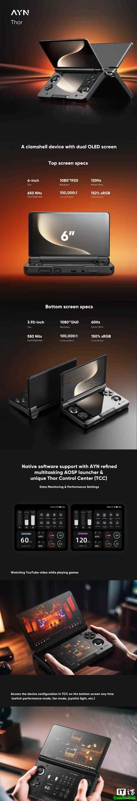 根据IT之家消息,今日AYN在其官网更新了 Thor 双屏掌机的详细参数。该系列掌机预计将在 10 月下旬正式上市,拥有黑色、白色、彩虹色、紫色四种配色可选,共有 Lite、Base、Pro、Max 四种变体,其中 Lite 版本采用高通骁龙 865 芯片,可通过 HDMI 接口输出最高 1080P / 60Hz 的画面;其余版本均配备高通骁龙 8 Gen 2 芯片,可输出 4K / 60Hz,两种芯片均配备主动散热。 各型号售价如下: Lite:8+128GB,249 美元(约合1782元人民币) Base:8+128GB,299 美元(约合2140元人民币) Pro:12+256GB,329 美元(约合2355元人民币) Max:16+1TB,429 美元(约合3070元人民币) 屏幕方面,四种变体的掌机均配备 6 英寸 OLED 上屏,其分辨率为 1080*1920,支持 120Hz 高刷,最高亮度可达 650 尼特,色域为 152% sRGB;下屏为 3.92 英寸,分辨率为 1080*1240,支持 60Hz 刷新率,最高亮度可达 550 尼特,色域为 150% sRGB。 另外,这四款掌机均配备 6000mAh 电池,内置全功能 Type-C 接口,采用双摇杆设计,按键布局类似任天堂手柄,在掌机左下侧还配有挂绳孔,屏轴采用加固设计。 系统方面,这款掌机搭载 Android 13 类原生操作系统,其内部搭载有专属调控软件,可于玩游戏时在下屏调整亮度、性能参数,并查看温度、帧率等信息,内置分屏功能,可在玩游戏的同时查看视频攻略。 |