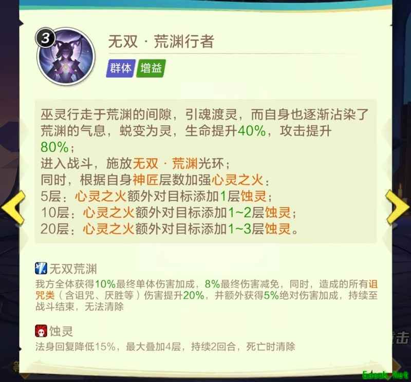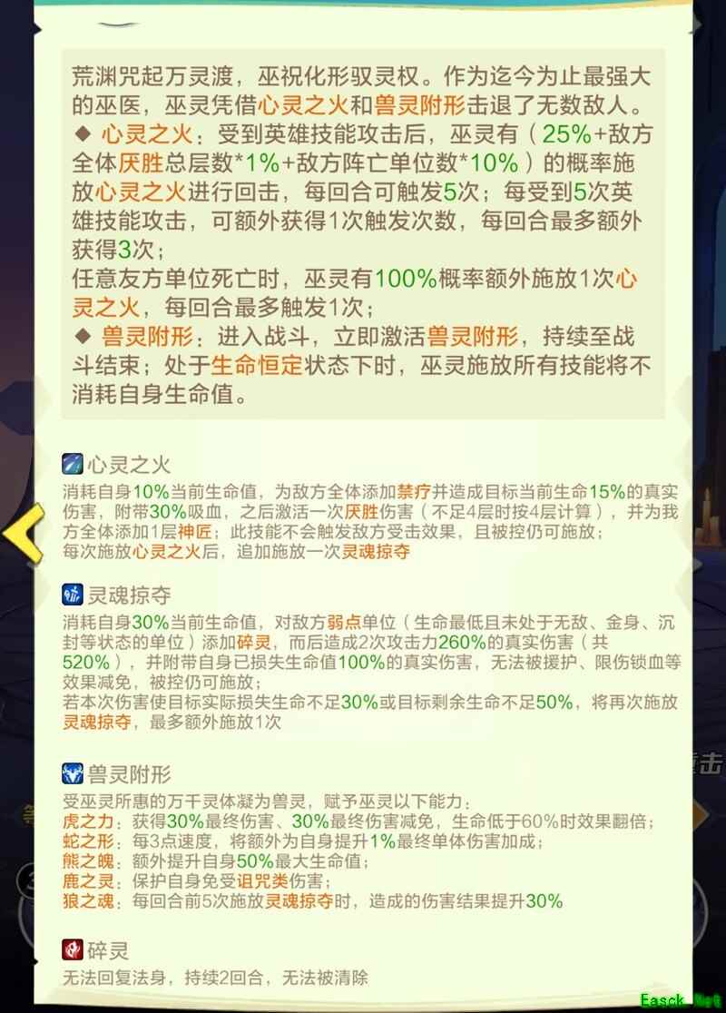 接下来需要配合逆击流的光环效果,当自身神匠层数激活对应的心灵之火特效蚀灵时,每5层心灵之火可转化为1层蚀灵,10层和20层时还可能分别提升至2至3层。蚀灵的效果仅有一项,即降低目标15%的法身回复能力。 许多人可能忽略这个光环效果,觉得并不特别,但在我看来,这恰恰是巫祝最值得留意的地方。其价值不在于实际效果或伤害输出(这方面确实一般),而在于它象征着法身时代的结束,生命时代再次回归战场核心。 从天启时代延续而来的法身机制,随着逆击系统的出现逐渐走向终结。嫦娥的一技能可恢复法身并附加逆回护盾,二技能则直接回复生命值,与巫祝通过消耗敌方生命值来造成伤害的机制高度契合。逆击体系侧重于强化防御与减伤,虽在表现形式上有所变化,但本质仍是通过替换原有生命值机制,转而采用逆回之盾及千机的元磁护罩来实现新的生存模式。 千机拥有自带的人偶替身,具备一管蓝血和100%减伤效果,受到攻击时会扣除怒气,并具备全体镜像反击能力(类似于和尚的机制,可理解为增伤效果)。该机制可与嫦娥配合,其二技能在角色满血状态下不会触发头顶效果(测试约20次,非完全确定)。因此,千机11星双人偶或12星单回合冷却人偶可提升巫祝获得生命回复的几率。 四技能·巫灵祝福 心灵之火:受到攻击后,依据厌胜叠加次数和敌方阵亡数量,有概率触发效果,消耗10%生命值造成15%真实伤害,恢复30%生命,并激活厌胜伤害,附加神匠状态。 兽灵附型状态下,伤害提升与减伤效果各增加30%,生命低于60%时效果翻倍;速度每提升3点,伤害增加1%;额外提升50%生命上限;免疫诅咒与厌胜效果,生命值稳定时不消耗生命释放技能。 十一星之后,每次心灵之火可额外发动灵魂掠夺,消耗自身30%生命对目标造成520%真实伤害,并基于目标已损失生命值追加100%真实伤害,无视援护、免伤机制及控制效果。 12星之后,兽灵新增狼魂属性,灵魂掠夺伤害提高30%;若实际造成的伤害未达30%,则会释放两次灵魂掠夺。 核心技能
