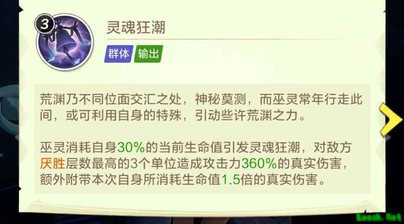 当然欢迎友好讨论和善意调侃,比如之前有朋友提到逆击可能不止三个,还质疑了剪刀石头布的猜想,结果证明我确实错了,哈哈。你看,游戏就是这样充满未知,总有更厉害的人让我不断学习,也希望大家一起进步! 好的,废话不多说,本文分为三部分:无双·荒渊巫祝的解析、我的玩法及原因,以及阵容推荐。 第一部分 通过分享我获取新英雄的心路历程与分析过程,希望能帮助大家在今后遇到新英雄时,能够自行理解与应对。 巫祝在五人队中担任主/副C角色,核心作用为抢先进攻、破阵及衔接团队配合。优先考虑搭配鲸鱼幻兽、星瀚二套装备(三件套提升20%速度)以及觉醒技能,以强化其先手作战能力。 灵魂狂潮·一技 巫祝消耗自身当前生命值的30%,对厌胜层数最高的三个目标造成360%的真实伤害,并额外附加相当于此次消耗生命值1.5倍的真实伤害。 怒气技能