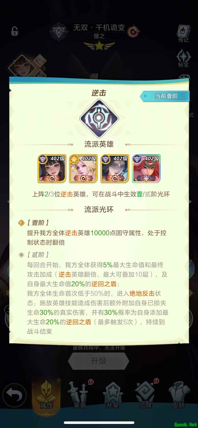 因此,针对逆击流的资源分配与考量如下: 千机目前通过随缘抽卡和囤积兑换券,因运气欠佳,暂时只有10星半,打算等返场后再升到11星。由于千机在10星时已具备大部分核心能力,且自身生存能力较强,因此对11星的迫切性不高。神兵方面选择白板即可,主要要求是能站稳阵脚。而星瀚装备因长期积累,目前已完成第三套整套配置,使得千机在战斗中输出不俗,配合全套星瀚装备,反击伤害相当可观。 嫦娥目前已升至11星,此前10星半时未登场,现已开启核心新月,具备上场条件。除装备外,其他配置均为全星瀚,能独立担任奶妈角色。需要注意的是,嫦娥的冰箱机制与孟婆的游魂效果冲突,同时触发时不兼容,因此即使需要双奶阵容,也建议选择玉环而非孟婆。 巫祝是逆击流的核心角色,她将千机与嫦娥的厌胜、逆回之盾及生命回复体系串联起来,具备较强的输出能力。因此,在她刚出场时我就迅速将其升至11星(活动结束前可达成),使她能够顺利登场并触发逆击光环。 Part III 【阵容搭配】 从前面的介绍不难看出我的阵容了吧?我推荐以下三套搭配: 使用千机、嫦娥、巫祝反制敌方阵容,主力输出推荐女娲和木兰组合。 逆击流需要满光环且体系融合,二者缺一不可。搭配上,中女娲与木兰最为契合,半身不遂的女娲只能搭配云梦。孟婆与嫦娥机制不合,因此木兰是最佳选择,其他细节分析暂且略过。 女娲与少司命为主C,搭配逆击流千机、嫦娥、巫祝组合。 目前已完成三套星瀚装备的积累,其他装备也均为星瀚品质,因此少司命即使处于3C位置,依然能够充分发挥出罪祸效果和强化普攻的能力。这不仅为主输出女娲提供增伤效果,也为副输出巫祝带来额外的真实伤害加成。同时,与巫祝的灵魂掠夺技能形成联动,协同针对敌方弱点,显著提升了整体清场效率。 每个人擅长的培养方向不同,对我来说,女娲搭配乔安、少司命搭配霍德尔、巫祝搭配玛格丽特,整体硬件组合比较顺畅。然而,战斗中伤害无效化的情况较为严重,尤其是少司命对硬件要求较高,实际效果往往不如预期理想。 女娲为主C,搭配逆击流千机、嫦娥、巫祝与黑骑。 这套组合虽然强势,被认为是当前版本的优选方案,但在实际战斗中,若黑骑未能达到神7境界,效果远不如预期。对我来说,难以将黑骑提升至神7,因此整体表现略显失望。 黑骑士神7配三战士出战,巫祝都惊讶的法身加成。