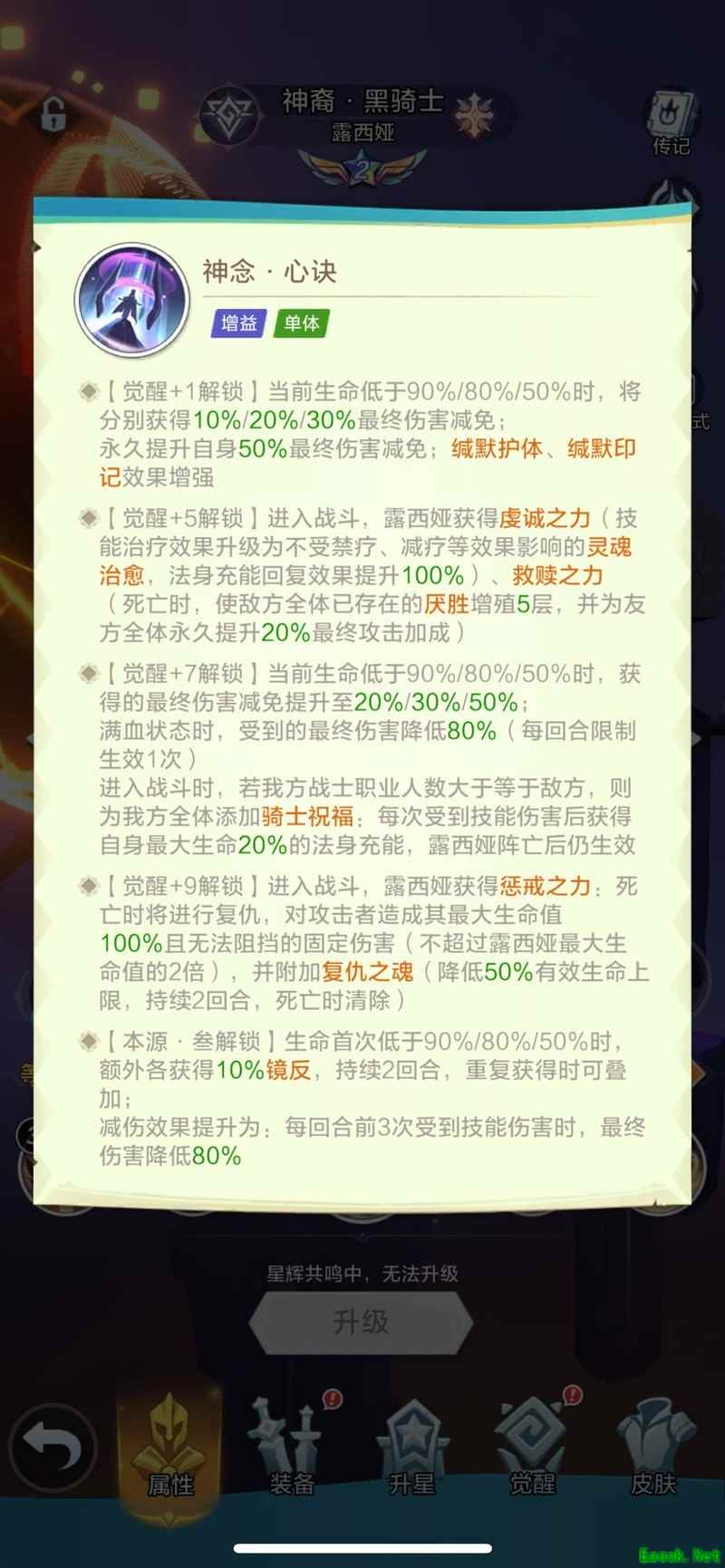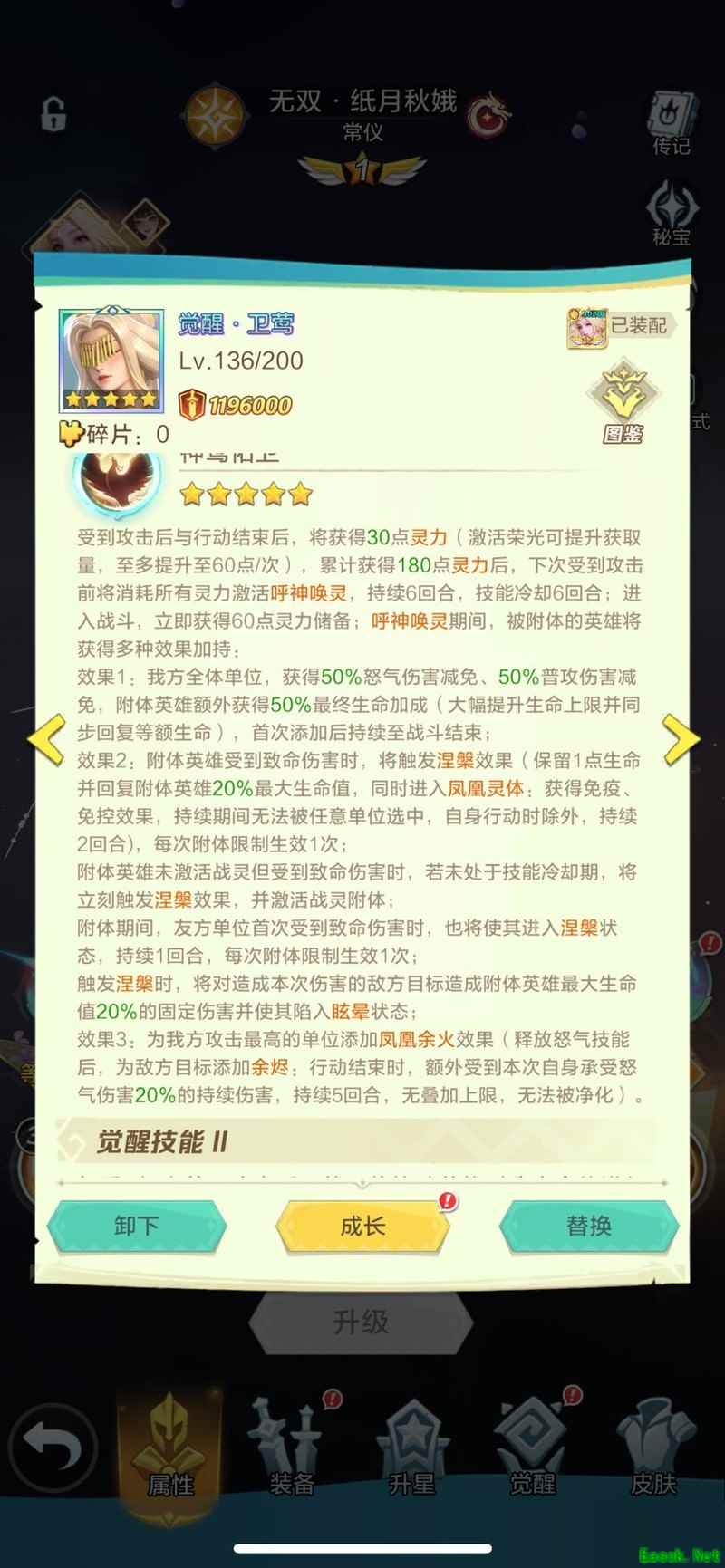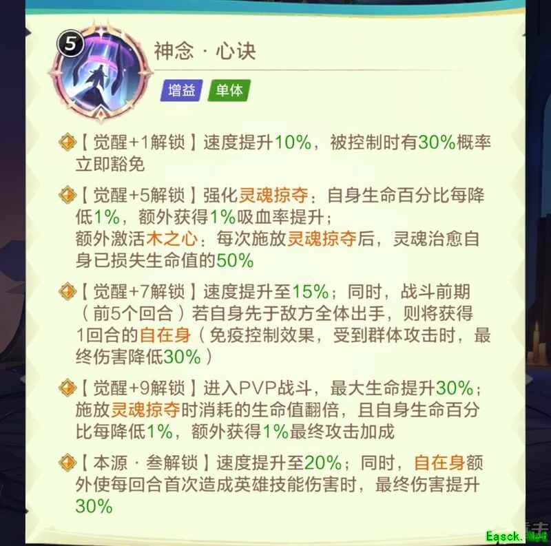 这才是巫祝的关键能力!心灵之火虽然受击触发,但只是辅助手段,真正核心在于灵魂掠夺带来的高额伤害。可以这样理解,前期依靠1技能压制血量,进入中后期,灵魂掠夺才是决定胜负的致命技能。 为充分发挥核心技能效果,我们需要采取以下措施: 觉醒达到5级后,巫祝的生命值每减少1%,吸血效果就会提升1%,同时还会获得强大的生命回复技能灵魂治愈。是否开启觉醒会让巫祝的表现有显著差异,觉醒后的战斗续航能力大幅提升。 一个依赖生命值输出伤害的英雄,仅有逆击流派提供的防御和护盾远远不够,自身还需具备吸血或回复能力。虽然队友可以提供增益效果,但不能过度依赖(比如女娲),4技能在10星解锁吸血机制,设计得恰到好处。 别忘了逆击光环Ⅱ的绝地反击状态,释放技能可额外附加自身已损失生命30%的真实伤害,与4技能完美配合,进一步提升灵魂掠夺的输出威力。 由于尚未晋升巫祝,光环技能尚未激活。