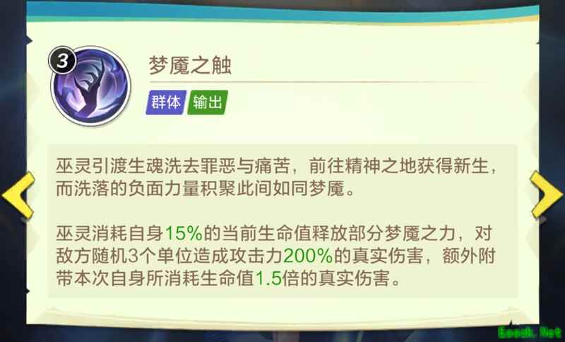 在我看来,这个怒气技能虽然表面看似与逆击机制无关,但实际上关联紧密。这是上古首个通过消耗自身生命来造成伤害的技能,其伤害高低直接取决于损失的生命值。当生命值满额时,消耗最多,伤害也最高。一速状态下满怒出手时,可造成高达45%生命值的真实伤害。作为输出角色,我应尽可能保持高血量来释放怒气一技能,最快捷的方式便是在满怒时第一时间出手。 释放技能会消耗生命值,容易导致死亡,因此需要有恢复手段。这就要求治疗角色专注于回复生命而非法力,或者自身具备吸血能力。以女娲为例,她不仅能吸血,还能将效果分享给队友,这使她能在逆击系列中作为残党登场。 二技能·梦魇之触 消耗15%生命值,对三个随机单位造成200%真实伤害,并额外附加自身消耗生命值1.5倍的真实伤害。 普攻技能