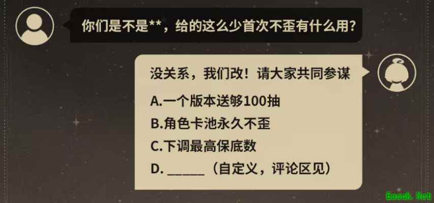既然都让玩家自己选了,玩家们自然是看热闹不嫌事大,纷纷选择D,在评论区提起了取消抽卡系统、取消体力系统等听起来完全不现实的方案。