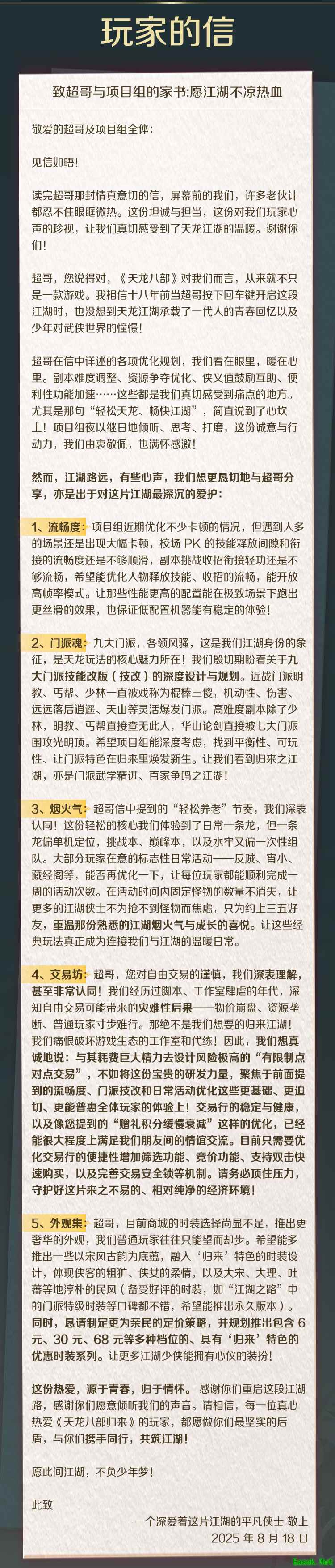 玩了这么多年游戏,我估计你跟我一样,没少在网上当键盘侠。 游戏里遇到点不爽,比如技能卡顿了,副本太难了,或者自己玩的门派太下水道了,反手就是一个长篇大论的帖子,发到论坛或者贴吧,把策划教育一顿。 但说实话,大多时候,这些帖子都是石沉大海。我们吐槽得口干舌燥,官方那边,连个回音都没有。 所以,前几天,《天龙八部·归来》端游的官方公众号,竟然挂出了一篇标题叫玩家千字长文‘教育’策划的推文时,我第一反应是:这又是哪门子的标题党营销? 结果点进去一看,发现,是真有这么回事。 一个自称平凡侠士的老玩家,在看到了之前初代策划超哥的亲笔信后,有感而发,也回了一封上千字的家书。 这封信,写得是真好。没有无能狂怒,全是爱之深,责之切的深度思考和诚恳建议。从游戏的流畅度,到门派的平衡性,再到日常玩法的烟火气,几乎把我们所有老玩家的心声,都给说了出来。 信的结尾那句愿此间江湖,不负少年梦!,更是瞬间就戳中了我的泪点。 看到这里,我已经觉得官方能把这封信放出来,就已经很有勇气了。 但我万万没想到,更硬核的还在后头——官方不仅挂出了信,还让初代策划超哥,对信里的每一个问题,都进行了逐条回复! 这一下,性质可以说彻底变了。不再是玩家单方面的吐槽,而是一场官方与玩家之间,平等、公开的隔空对话。 我把策划的回复,仔仔细细地看了好几遍,总结下来就俩字:靠谱! 关于咱们最关心的【流畅度】问题,官方没回避。直接承认,现在的卡顿主要是模型多的锅,并给出了具体解决方案:优化角色显示上限、检查技能后摇、高帧率模式马上开放。 不画饼,直接给方案。 关于【门派魂】(平衡性),官方自揭伤疤。直接点出了玩家戏称的丐帮三傻(明教、丐帮、少林),并明确表示,这三个门派就是近期的优化重点!这种态度,比说一万句我们会关注平衡性都管用。 策划承认,因为游戏人数超过预期,导致了抢怪问题严重。并给出了解决方案:宵小和藏经阁已经调整,动态刷新机制正在开发中。 能承认自己的预估失误,这在游戏圈里,可不多见。 关于【交易坊】(自由交易),官方坦诚布公。明确说了,暂时不开自由交易,是为了防工作室和稳定物价,这是在坚决站在普通玩家的收益上。但同时也承诺,预购取消、重楼材料竞价这些便利性功能,已经在开发了。有坚持,也有优化。 还有像内置语音、珍兽繁殖时间缩短、误卖贵重物品保护这些咱们念叨了很久的细节,官方也都在回信里,一一给出了明确的排期。 看完这你来我往的一封信、一封回信,我心里挺感慨的。 我突然觉得,官方说的【轻松天龙】这四个字,不仅体现在10分钟一条龙这样的玩法上,更体现在这种不心累的沟通氛围中。 我们的反馈,不再是石沉大海。我们提出的问题,能得到及时、真诚、有效的回应。我们感觉自己,不再是一个单纯的消费者,而是一个真正的参与者,在和官方一起,让这个江湖变得更好。 就像官方推文里说的那样:这封信让我们真切地感受到,这片江湖,从来都不是我们独自在守护。 你的声音,正在塑造这个江湖! 所以,兄弟们,如果你还在因为游戏里的一些小问题而感到不爽,别光顾着在群里吐槽。 不妨也像那位平凡侠士一样,勇敢地发出自己的声音。很多玩家,都已经开始在官方推文下方的评论区留言了! 因为在《天龙八部·归来》端游这个江湖里,你的每一条建议,都可能成为下一次更新的内容。 这,或许才是我们这些老玩家,最想要的归属感。 |