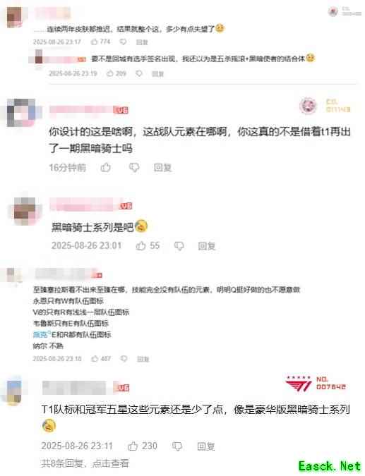不少网友觉得冠军皮肤和黑暗骑士系列完美撞色,一下子把含金量降低了。 也有许多玩家表示本次的皮肤中的T1对标、五星冠军元素太少。