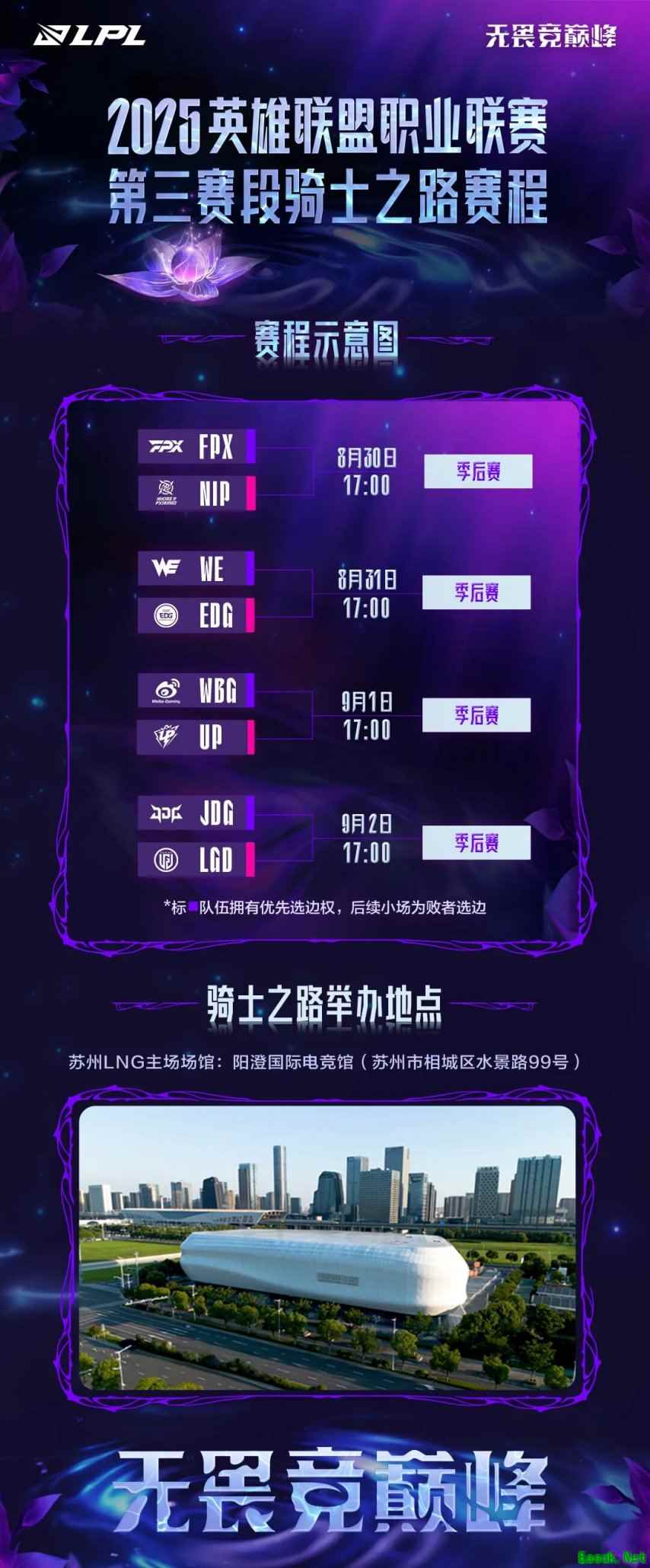 2025LPL第三赛段骑士之路将在8月30日-9月2日期间于苏州LNG主场举行,本阶段由登峰组WBG、JDG、WE、FPX四支队伍与涅槃组NIP、EDG、LGD、UP四支队伍,根据排名对阵进行单败BO5比赛,获胜的四支队伍获得最后四个进入季后赛的名额。骑士破千嶂,剑刃斩重关,8月30日-9月2日,2025LPL第三赛段骑士之路,无畏竞巅峰!