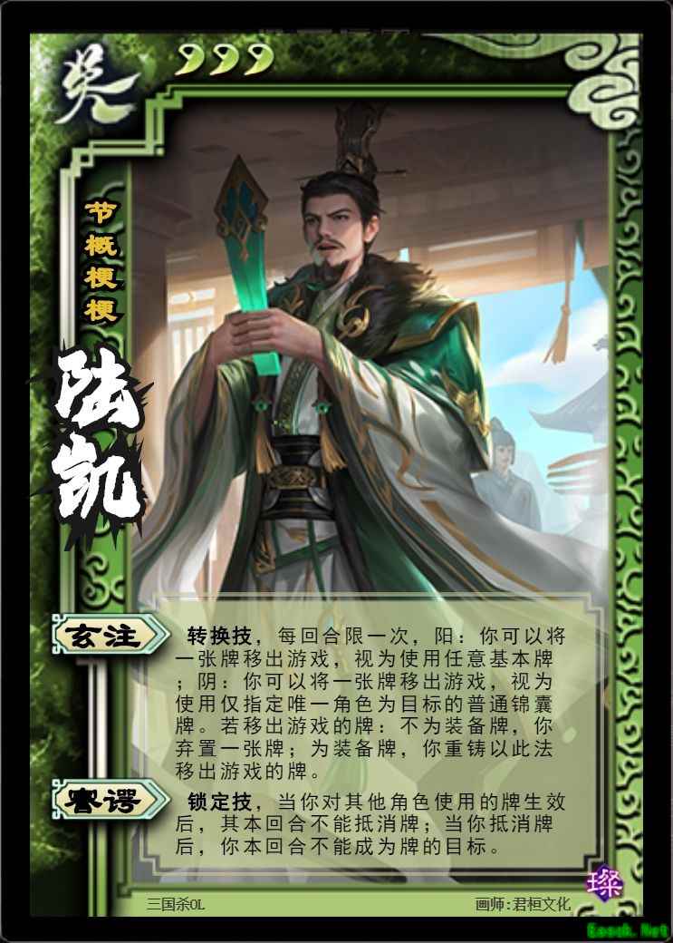 三国杀OL互通版迎来新将——吴国三体力传说武将陆凯正式登场!他拥有〖玄注〗与〖謇谔〗两大技能,兼具过牌与印卡能力,被玩家戏称为青春低配版龙凤。本期攻略由国服第一杨彪带来,深入解析陆凯的技能机制、实战技巧与强度评估,助你掌握这位壕将的真正实力! 国服第一杨彪原创作品 微信搜索三国桃园小程序,更多精彩内容等你探索~ 不知道大家有没有发现,最近三国杀OL推出新武将的节奏明显变慢了。自从三月初闪闪节上线了谋袁绍和郭图后,后续活动基本都是旧将返场。如今已经到了四月清明时节,曾经在测试中出现过的武将陆凯终于正式登场。最早接触陆凯时,很多玩家觉得他有点像青春低配版的卧龙凤雏,因为他的印卡机制与龙凤十分相似,还自带一个类似小强、命硬、智迟的小技能。整体来看,陆凯的两个技能都有一定的可玩性,那么我们在实际对局中该如何掌握他的使用技巧?他又是否具备作为强势武将的资本?下面我们一起来详细解析这位新武将的表现与强度。 一、武将介绍 势力:吴国 体力:三滴 品质:传说级 1.武将生平 2.武将技能 3.武将台词 4.武将特点 获取时间为2024年4月4日00:15至4月12日23:59,可通过祈愿台随机获得,也可使用传世玉玺兑换。 二、技能分析 陆凯作为一名三体力武将,拥有两个技能——〖玄注〗与〖謇谔〗。这两个技能之间关联性不强,因此我们将分别进行分析和讲解。首先,我们来看看他的第一个技能〖玄注〗。 转换技,每回合限用一次。阳:可将一张牌移出游戏,视为使用一张基本牌;阴:也可将一张牌移出游戏,视为对唯一目标使用一张普通锦囊牌。若移出的牌不是装备牌,则需弃置一张牌;若为装备牌,则可将其重铸。 陆凯的技能玄注属于一种印卡机制,要理解这个技能,首先需要了解印卡的具体效果。印卡机制在某种程度上与某些武将的技能类似,比如龙凤组合的游龙,同样属于转换技。不过,玄注常常被玩家戏称为低配版游龙,原因主要有两点:其一,陆凯每回合只能发动一次玄注,而游龙则是每轮每项限一次,这意味着在单个回合中,游龙有机会发动两次;其二,在印卡种类上,游龙能够印出无懈可击和群体锦囊等高价值牌,而陆凯只能印出单体锦囊,无法获得这些更具战略价值的牌。 尽管如此,陆凯并非毫无优势。玄注允许他重复印制相同的牌,没有次数限制,这在某些情况下是非常实用的能力。此外,与游龙需要废掉装备区不同,玄注的代价相对灵活,操作空间更大。 接下来我们来看玄注的发动条件。初看之下,很多玩家会觉得这个技能类似重铸装备来印卡,或者需要消耗两张牌来完成一次印卡动作,因此容易造成手牌的亏损。也有部分玩家对移出游戏和重铸移出游戏的牌这两个概念理解不清。其实,陆凯发动玄注时将牌移出游戏的动作,类似于界陆逊使用谦逊时将牌置于武将牌上的操作。这些被移出的牌(我们称为玄注牌)会一直显示在陆凯的武将牌上。当陆凯使用装备牌进行印卡时,首先将该装备牌移出游戏,随后会重铸所有已被移出的玄注牌。正因为如此,陆凯在满足条件时可以实现高强度的爆发——通过不断印卡积累大量玄注牌,再利用装备牌触发重铸,从而在回合内实现强力的过牌效果。 使用玄注时需要注意以下几点: 首先,在发动技能时,必须先将玄注牌移出游戏,随后进行印卡操作。结算完毕后,若移出的牌是装备牌,则触发重铸;如果不是,则陆凯需要弃置一张牌。因此,若想实现重铸效果,应优先移出装备牌,否则将错失重铸机会。 其次,由于装备牌在实战中获取概率较低,因此玄注的重铸收益通常体现在后期。我们可以将其理解为以两张牌换取一张所需牌的效果,这使陆凯在游戏过程中较易陷入手牌紧张的困境,需要依赖队友的补牌支持。 玄注是一个每回合限一次的转换技,建议将印基本牌的效果保留至回合外用于防御,同时结合謇谔技能起到震慑作用;而印锦囊牌的效果更适合在回合内使用,以最大化收益。 〖謇谔〗锁定技,你对其他角色使用的牌生效后,其本回合无法抵消牌;当你抵消牌后,你本回合不能成为其他牌的目标。 陆凯还有一个较为简单的技能,分为两个效果,我们逐一分析。 当你对其他角色使用的牌生效后,该角色在本回合内将无法抵消其他牌的效果。此技能在实际运用中会涉及一些具体的判定细节,以下几点需要特别注意: 首先,抵消牌指的是使用来抵消,或使用来抵消锦囊牌的效果,这一点可以参考吴懿的技能〖奔袭〗。而响应则是指使用或来应对、或等牌,因此获得謇谔效果并不会影响角色对这些牌的响应。 其次,陆凯使用的时机是在成功命中之后,因此若希望对方获得謇谔效果,应尽量避免优先出。 再者,当陆凯使用普通锦囊牌并指定目标后,只有在目标未被抵消的情况下,目标才会获得謇谔效果。 此外,当陆凯使用如、、、、等多目标锦囊牌时,只要其中一个目标未被无懈抵消,其余目标均会获得謇谔效果,因此在多数情况下,使用多目标锦囊牌后,除陆凯自身外的所有目标都会获得该效果。 对于延时锦囊而言,虽然其效果在判定生效后触发,但在实战中,若陆凯在其他角色的回合中发动延时锦囊,目标并不会获得謇谔效果。 当你使用牌抵消效果后,本回合内你将无法成为其他牌的目标,类似于获得了一个类似智迟的状态。不过,如果对手拥有直接伤害类的牌,而陆凯此时拥有无法成为目标的特性