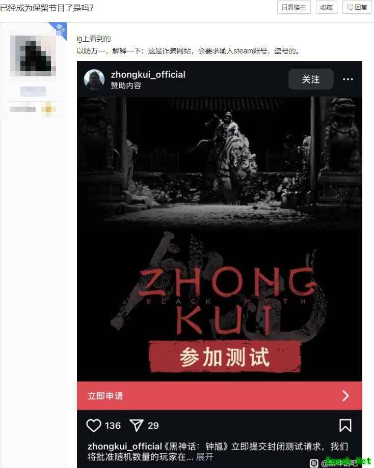 近期有贴吧网友反映,在Instagram平台上出现了多个冒充《黑神话:钟馗》官方身份的虚假账号。这些高仿账号通过发布虚假的游戏测试招募信息来吸引玩家点击链接并提交个人敏感信息。
