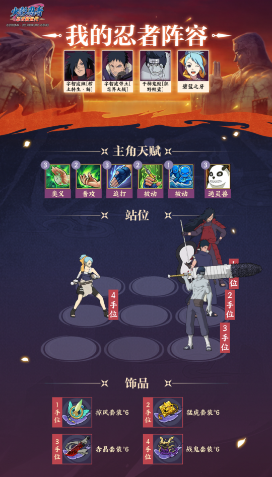 当药师兜的秽土转生之术被宇智波鼬破解,忍界联军以为噩梦将结束之时,宇智波斑却以"秽土转生·解"的结印打破了生死法则,挣脱了术者的控制,以不死之躯立于战场。 ![]() 此刻的宇智波斑,不仅保留着秽土转生赋予的无限查克拉与恢复能力,还解放了轮回眼与木遁的力量,成为了第四次忍界大战中忍者联军所有人的梦魇。 将血继限界、战术智慧与不死之躯完美融合的战场玫瑰——宇智波斑[秽土转生·解],现在登录了《火影忍者:忍者新世代》封印招募,快加入游戏中一起见证须佐能乎的终极形态,斩山裂地的破坏化身!超越生死的战场修罗! ![]() 一、忍者简析: ![]() 奥义Ⅰ:完全体须佐能乎:对敌阵营6到8体造成100%的血量伤害,选定目标打断,击退并附带斑的威压。释放后奥义改为完全体须佐能乎·破坏。必杀时必中并重启结界。 Tip:阵营伤害,伤害系数可观,并且奥义后可衔接追打状态,同时解锁二段奥义,压制力非常强。 奥义Ⅱ:完全体须佐能乎·破坏:(2/0/20)[查克拉转冷却释放],对敌小队造成120%的血量伤害,选定目标附带打断和倒地,敌方阵营每存在1体附带斑的威压的角色,则该技能伤害提升20%,至多100%。{必杀时必中并重启结界}。 Tip:小队伤害,而且拥有查克拉转冷却释放的效果,所以相当于查克拉充足的情况下,每回合都能释放奥义,并且根据斑的威压的数量,还会提高伤害上限。 普攻:须佐能乎·极:对敌小队人数最多的一横行敌人造成80%的血量伤害和10连击,大概率附带倒地和斑的威压。 Tip:一横行的血量伤害,主要是能造成斑的威压,同时能造成10连击和倒地的状态,为整体技能做铺垫。 追打:火遁·龙炎放歌之术:追打10连击,对敌小队后2排造成30%必中的血量伤害和点燃,若命中附带斑的威压忍者则本回合斑获得1次追打,上限3次。每次释放伤害成长20%。 Tip:斑的核心输出技能之一,非常容易触发的追打,能造成必中的血量伤害,次数多,成长高,对后2排忍者的伤害非常高。 被动Ⅰ:宇智波反弹:50%概率闪避带有忍术伤害的攻击,并对攻击方造成80%伤害和斑的威压。斑拥有秽土转生复原和查克拉吞食,且己方小队每次追打,斑成长12%体忍,每回合最多60%。 Tip:能概率闪避掉纯忍和体忍伤害,在当前环境中触发的频次会非常高,然后会造成斑的威压。其次查克拉吞食能夺取对方的普攻次数和全部增益以及查克拉。秽土转生复原则是提高了斑的生存和操作上限。然后可以通过小队来养成自身的体忍,配合奥义或追打,能造成更高的伤害。 被动Ⅱ:忍战无双:斑拥有须佐能乎·守且免疫目盲以外的不良状态。己方小队奥义冷却不为0的忍者受到奥义伤害减免50%。斑对非忍者单位造成的伤害提升100%。战斗开始及偶数回合开始时,获得100必杀值并开启1回合结界:木遁·树界降诞。 Tip:卡卡西斑释放奥义后,能给全小队免疫3次暴击,同时还能为奥义冷却不为0的忍者提供奥义伤害减免,大大提高了小队忍者的生存,同时斑能展开结界,为小队忍者提供伤害减免,并且增加敌方的查克拉消耗,还有造成树缚的能力。 ![]() 特殊词条: 点燃:回合结束受到伤害,且无法被治疗,持续1回合。 血量伤害:无视护盾,直接造成血量伤害。 树缚:封印术,无法普攻,持续至回合末。该效果无法被免疫,可驱散。 斑的威压:特效,普攻伤害降低50%,受到[追打]伤害增加30%,获得必杀值降低99%,持续2回合,不可叠加。 查克拉吞食:己方小队每回合首次释放奥义后触发,对敌方阵营随机1体忍者造成100%必中伤害,击退和斑的威压,抽取20点查克拉并夺取其当前的普攻次数和全部增益。秽土转生复原:首次受到致命伤害时,保留30%最大生命值并获得90%伤害减免,持续至回合结束。同时获得20点查克拉,奥义冷却清零且可立即释放,并重启结界。 木遁·树界降诞:己方小队忍者下次受到伤害减免99%,敌方阵营随机1体忍者下次释放奥义查克拉消耗+20点,不可叠加,结界存在时,敌方阵营忍者释放奥义后获得树缚。须佐能乎·守:斑每次释放奥义,己方小队每人免疫3次暴击,持续至回合结束,不可叠加。 忍者定位:攻守兼备、忍术反弹 推荐饰品:猛虎、灵狐、掠风、玄龟套装 二、搭配思路: 1、结合宇智波斑[秽土转生·解]的技能特点,一图流搭配推荐: ![]() 2、与宇智波斑[秽土转生·解]搭配阵容忍者的优点: (1)鸣人[九喇嘛连结]拥有较多分身,可恢复查克拉、提供免伤并累积尾兽点,可多次使用奥义,奥义和暴击率成长较好,奥义御可以恢复血量、免于死亡并减少奥义冷却时间,可终止追打链; (2)宇智波止水[须佐能乎]具有养成速度快的特点,被动能激活追打达成回合外输出,无论输出或是辅助都有不俗的效果,幻术封印可干扰敌方操作,濒死可触发别天神,混乱敌方,拥有较强的生存能力; (3)干柿鬼鲛[狂野鲛鲨]受到忍术伤害会回复查克拉,当对方查克拉较高时会造成更高伤害,累积刀技可展开结界,增加我方忍者体忍; (4)宇智波带土[忍界大战]拥有强力追打,展开结界后可获得减伤,切换奥义后还具备移除战斗效果; (5)千手柱间[和服]可分担队友伤害,提升敌方奥义消耗,恢复查克拉,阵亡后可增加队友免伤次数以及各种属性提升; (6)天天[忍界大战]可目盲对方忍者,自身拥有不错的追打伤害; (7)宇智波佐助[侠客列传]拥有雷火双属性辅助能力,能提升雷属性额外普攻、火属性追打次数,能为全体驱散不良状态外,自身也拥有不俗的单体输出能力; (8)宇智波鼬[绛月之侍