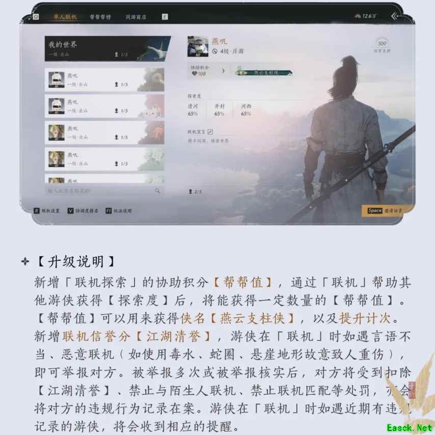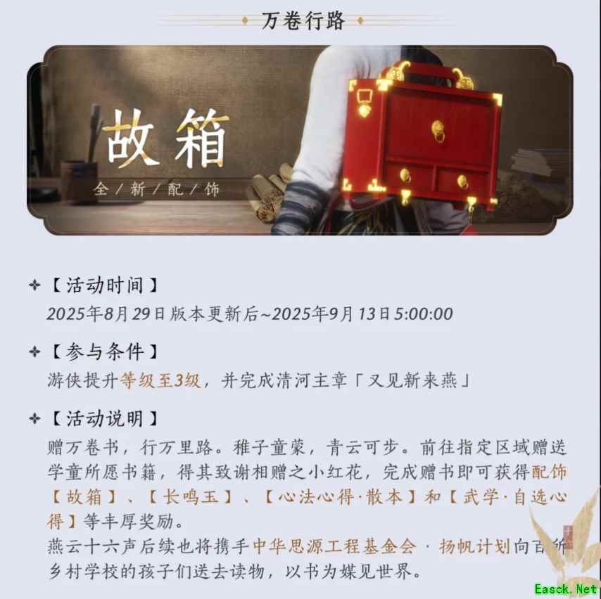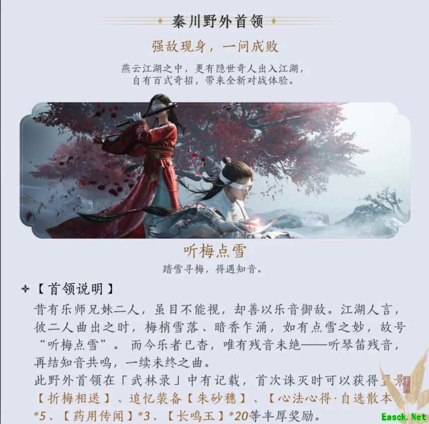 维护时间29号7:00-15:00 补偿200长鸣玉 更新前一定要完成镇守大散关!没过的今天抽空去过,不然无法前往新地图秦川!! 1.可完成侠迹·卷六,完成后获得【药用传闻】、【长鸣玉】等奖励. 2.挑战新野外首领“听梅点雪”,首次击败可获得置景【折梅相送】、追忆装备【朱砂穗】、【心法心得•自选散本】 3.秦川新据点萧关古道,首通可获得长鸣玉、月华通宝等奖励. 4.获取新奇术【闲风追月】,进入秦川后可领悟. *5、【药用传闻】*3、【长鸣玉】*20等奖励。完成试炼挑战可以获得头像【听梅点雪】、徽章、长鸣玉等奖励。 接下来是新活动 1.秦川月笺录,需完成镇守大散关,活动期间,可前往「溯光探索」参与各种秦川挑战玩法,完成「溯光探索」与「影踪志略」相关玩法任务后,即可获得头饰【画鬓春】、【绕梁之音】、【长鸣玉】、【心法散本】等奖励。 2.笔落秦川,需完成镇守大散关,版本更新后,可前往山河映辉场景,正式开启「秦川」地区,也可解锁「星绘旧忆」秦川区域全新留影路点,参与可获得置景【金秋香】、置景【夏荫凉】、【长鸣玉】等奖励。 3. 鹊衔佳期,可以在单人或多人模式中参与「云蔚绘影」、「巧偶天成」、「两心相契」、「步步生花」玩法,可获得配饰【乐陶陶】、配饰【陶乐乐】、【绕梁之音】、【念知音】,【长鸣玉】等奖励。 4.万卷行路,参与活动前往指定区域赠送学童所愿书籍,得其致谢相赠之小红花,完成赠书即可获得配饰【故箱】、【长鸣玉】、【心法心得•散本】和【武学•自选心得】等奖励。 另外联机协助还可累计帮帮值解锁称号【燕云支柱侠】 以上就 |