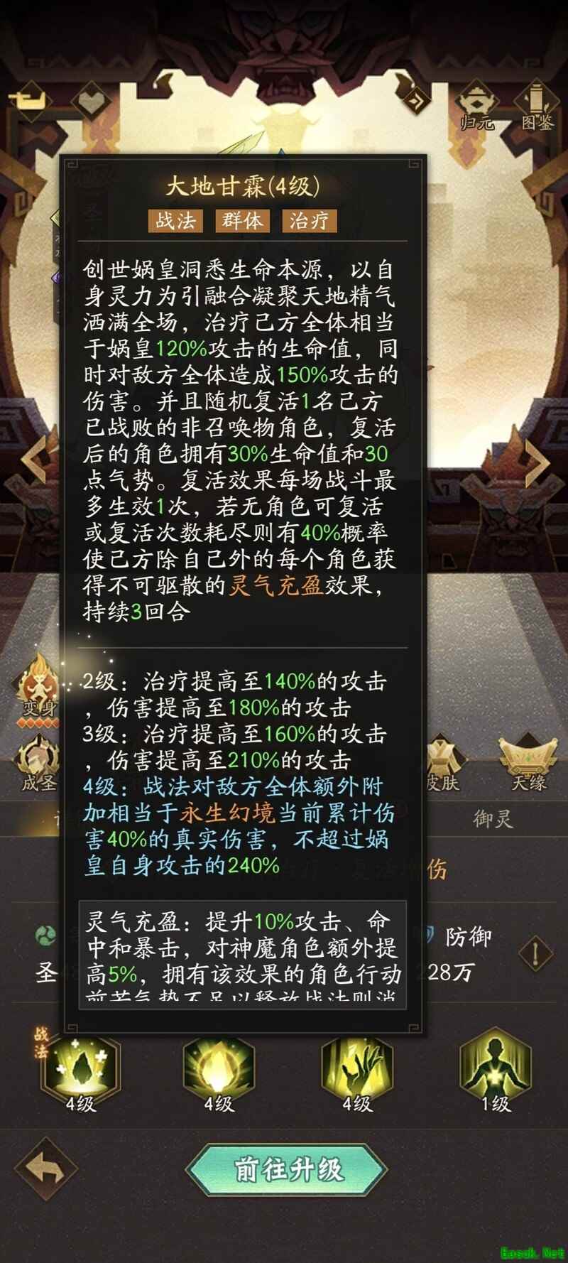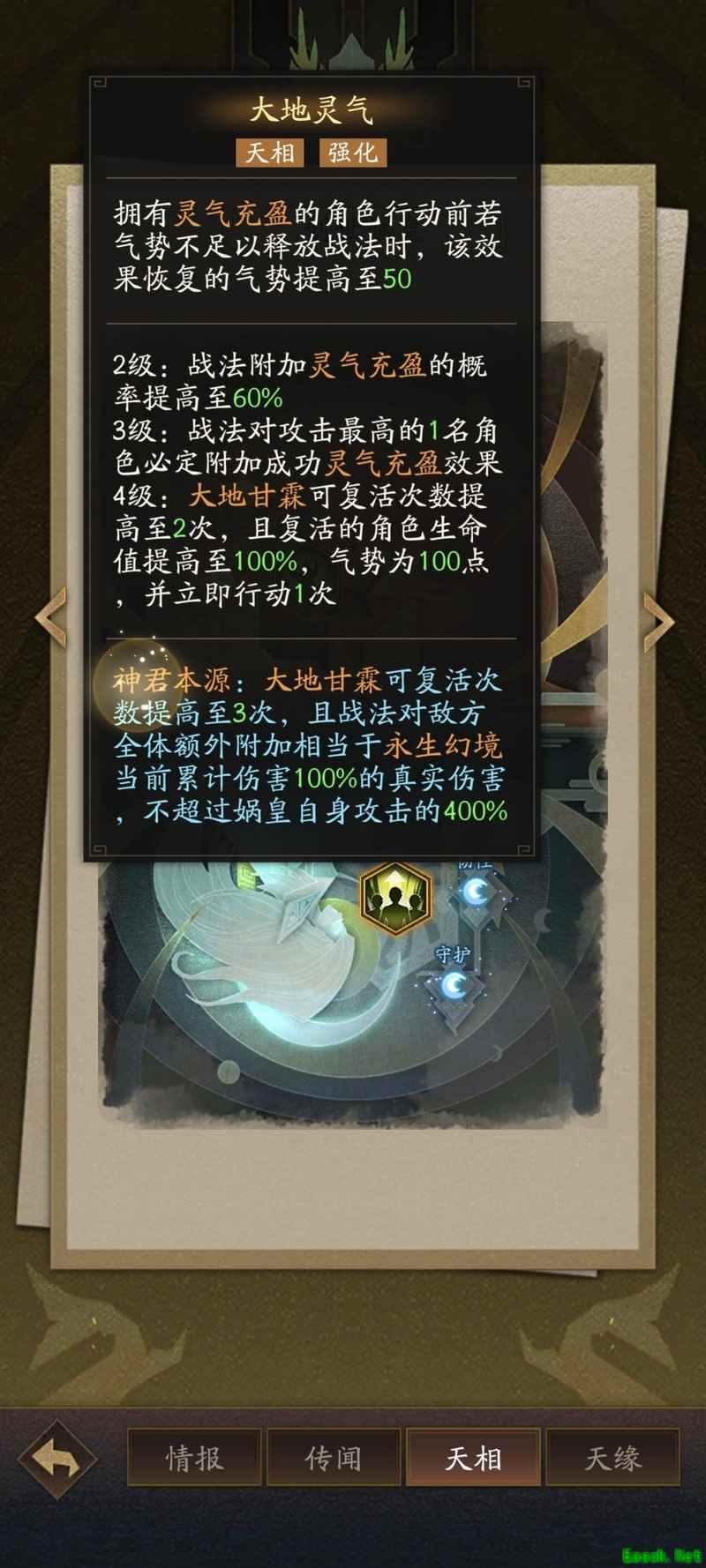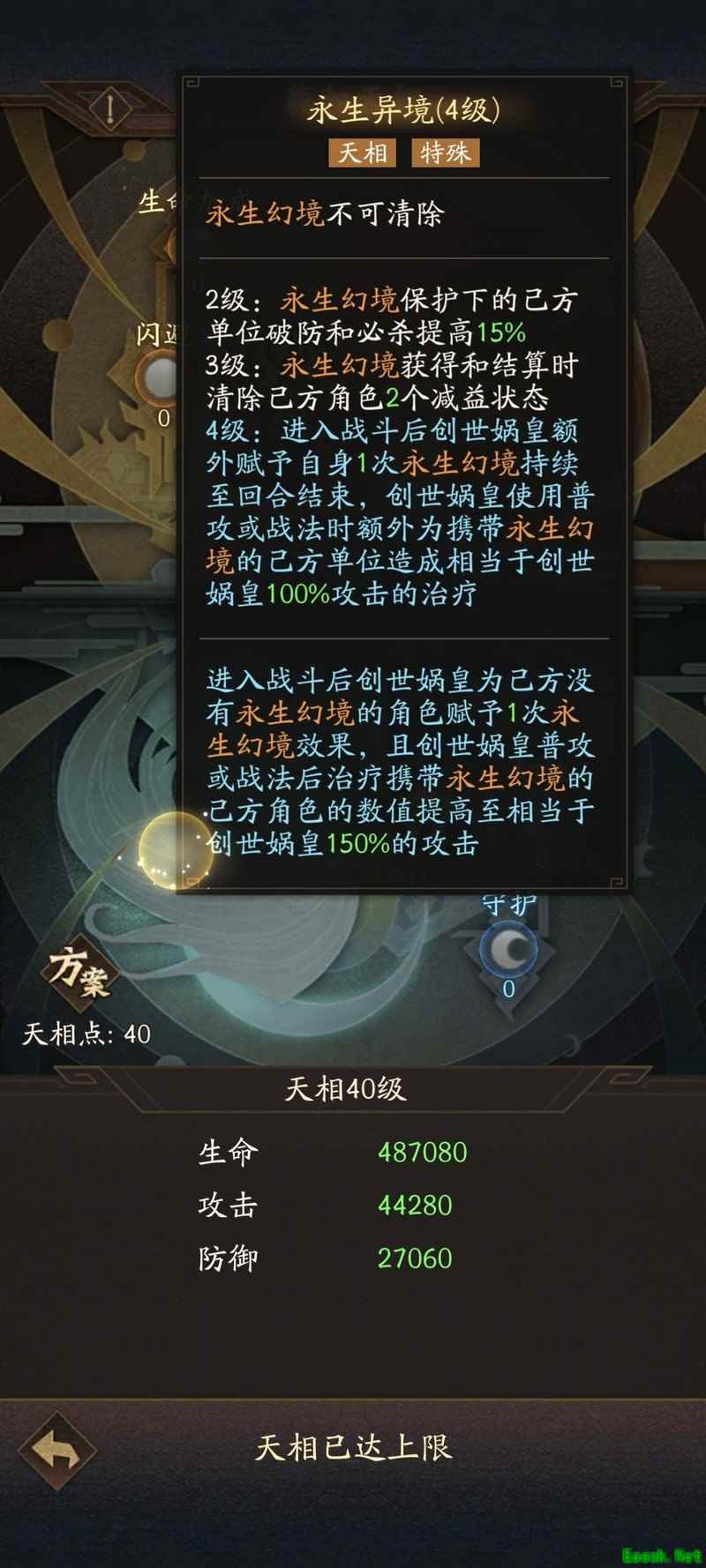 神仙道3全新术士神魔登场!继石矶之后,时隔10个月迎来这位全能型辅助神魔,集回血、回气、增益、减伤、复活、立即行动于一体,堪称万金油。其核心机制永生幻境有效遏制一波流,助力主角飞羽+御灵蛇+娲皇组成当前T0阵容,值得全力培养! 继石矶之后,时隔十个月,全新术士神魔终于登场。 娲皇是一张性能强劲且极具保值性的辅助类神魔卡牌,具备增益、回血、回气、减伤、多次复活、满血满气以及立即行动等多种功能,堪称全能型辅助。其特有的永生幻境机制,有效遏制了一波流战术的发挥。目前版本中,已形成以主角飞羽搭配御灵蛇与娲皇为核心的强势T0阵容。 【培养建议】 拉满 【娲皇关键词】 恢复气血,增强多种属性。 减伤复活,立即行动。 大地甘霖战法 娲皇为己方全体恢复相当于其攻击力160%的生命值,并对敌方全体造成其攻击力210%的伤害。此外,战法还会根据永生幻境当前累计伤害的40%附加真实伤害,最高不超过娲皇攻击力的240%。 为己方全体恢复生命,触发悬壶效果,治疗无需命中判定,且可暴击。 对敌方全体发动攻击,需命中目标,若战法未命中,则附加真实伤害不会触发。 娲皇施展战法,随机复活一名己方非召唤物角色,复活角色拥有30%生命值与30点气势。 角色若生前拥有100气势,死亡后气势归零,复活时仅恢复30气势,并不会累计至130。 当己方仅有一名角色阵亡时,仅复活该角色。 复活效果每场战斗限用一次,若无法复活角色或次数已用尽,则有40%概率为己方除娲皇外所有角色附加不可驱散的灵气充盈状态,持续三回合。 灵气充盈效果可提升攻击、暴击与命中各10%,面对神魔角色时增益额外提高5%。当拥有该效果的角色行动前气势不足时,可消耗灵气充盈获得25点气势以释放战法。 特别地,像飞卫这样的英雄在释放战法时所需的气势会逐渐减少,最终降至0。此时,飞卫可以无限释放战法,灵气充盈效果也将持续存在,不会被消耗。 若战场已无空位,女娲释放战法无法复活队友,也不会消耗复活次数。待有空位时再次释放战法,即可复活己方队友上场。 普通攻击:补天神石之力 普通攻击180%,表现一般 被动技能效果 每个回合开始时,娲皇会为生命值最低的己方非召唤物角色施加永生幻境,效果持续到回合结束。 永生幻境生效期间,己方单位获得的治疗效果提高20%。该效果由永生幻境触发时,不会重复选取同一目标,也不会选择娲皇自己。 每个回合开始时,会赋予生命值最低的角色永生幻境。由于开局时如隔离状态、龙珠效果会优先生效,若生命值最低者被隔离,娲皇将选择另一名生命值次低的角色施加该效果。 拥有永生幻境效果时,角色受到的治疗效果增强20%,仅提升治疗回血,不增强恢复类回血效果。 通过这种方式释放的永生幻境,不会连续两次选择同一个目标。例如,第一回合选择了A,第二回合即使A仍是生命值最低的,也不会再次选择A;直到第三回合,若A依旧生命值最低,才会再次选择A。这表明目标的选择会间隔一轮,不会出现连续重复的情况。 觉醒力量,开启新纪元。 当己方全体(含娲皇)累计受到超过自身最大生命值40%的伤害时,娲皇将立刻为目标恢复相当于其攻击力160%的生命值,并使其下一次受到的伤害降低24%,该效果可被清除。 当娲皇被控制时,此效果也会触发;若目标是娲皇自身,则清除她所有的控制状态。 当己方非召唤物角色战斗失败时,娲皇会立刻恢复100点气势,但此效果可被逐日力竭、法象龙、应龙的绝对零度所削弱或抵消。 傀儡师将娲皇变为羊时,此效果可暂时解除。 大地灵气,日相蕴含自然之力。 当角色拥有灵气充盈效果时,在行动前如果气势不够释放战法,会恢复50点气势。 该恢复气势会随时间减弱,也会被应龙的绝对零度削弱。 战法附加灵气充盈效果的概率提升至60%,并且必定会为己方攻击力最高的角色附加该效果。 这个效果非常实用,60%的概率已经很高了,而且主C一定能享受到灵气充盈的加成。 ③娲皇战法:大地甘霖,使角色可复活次数增至2次,复活后生命值和气势均恢复至100%,并立即行动一次。 可完全恢复生命与能量并立刻行动一次,效果十分强大。 日本首相与神君本源相关内容。 战法大地甘霖可复活次数提升至3次,同时对敌方全体附加等同于永生幻境当前累计伤害100%的真实伤害,最高不超过娲皇自身攻击的400%。 大幅提升复活效果,并增强娲皇战法的真伤附加能力。 六、月相 永恒梦境无法抹去 质变后永生幻境生效,前排稳固不易被魔女清除。 拥有永生幻境效果的角色,破防与必杀提升15%。 这buff仿佛是为飞羽量身打造的。 进入永生幻境时,结算效果并清除两个减益状态。 只清除可被移除的负面效果。 进入战斗时,娲皇为自己施加一次永生幻境,效果持续到回合结束。每当她使用普通攻击或战法时,都会额外为带有永生幻境的己方角色恢复相当于自身攻击力100%的生命值。 提高娲皇自身生存能力,同时频繁触发悬壶为队友回血增益。 月相神君本源,蕴含神秘力量。 战斗开始时,娲皇为未拥有永生幻境的己方角色附加一次永生幻境效果。当娲皇进行普通攻击或释放战法时,还会额外为其赋予永生幻境的友方角色恢复相当于其攻击力150%的生命值。 大幅增强全体队友的生存能力,有效抵御快速进攻。 满级时激活特殊属性 10%暴击 8.【天相建议】 闪避提升15,韧性增加14,生命恢复1点。 月相:坚韧如月,守护如光。 9.【