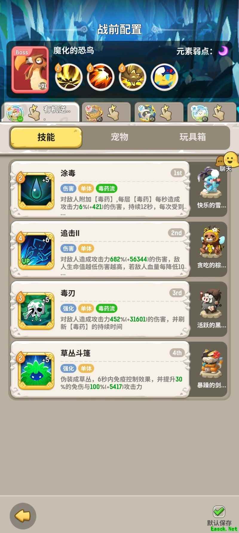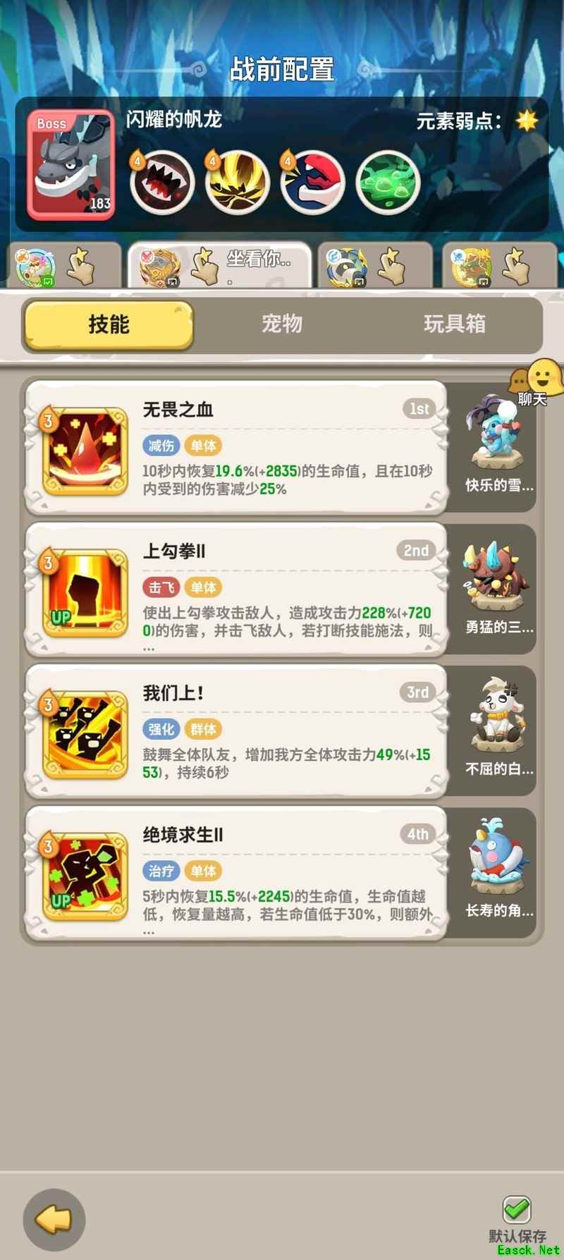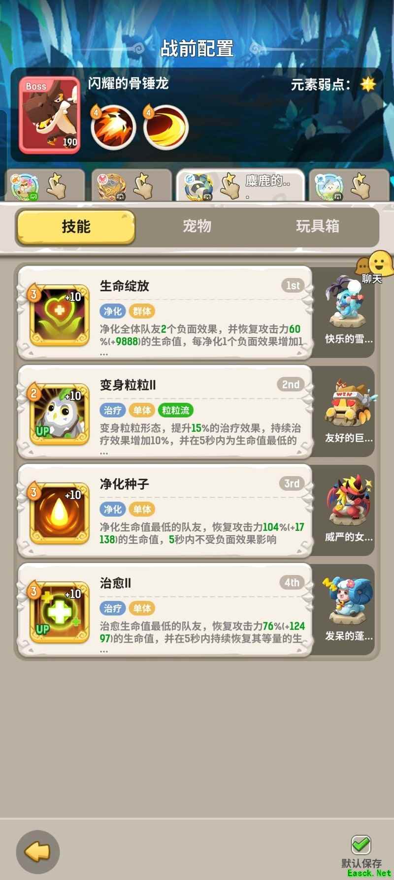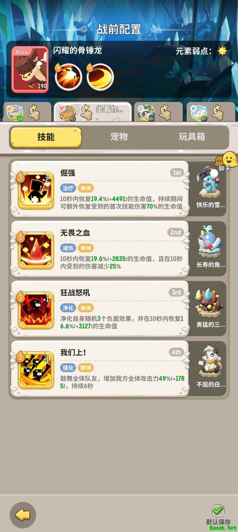 好久没认真研究配队了,自从新版本上线后很多玩法都发生了变化,这边打算继续更新一些推图的记录(后续会根据进度持续补充,如有不足之处还请各位大佬多多指正)。 我们队伍卡住的怪物较多,有时并非极限作业。 3.9 幽暗戈壁7 帆龙(阵容总价值4900万) 降低攻击令人烦恼,可选择用药缓解。 2.净化负面 3.带抵抗 成功击败骨锤龙与帆龙的最终幽暗一役! 骨锤龙2.0版本现身幽暗戈壁192区域,强势登场。 这边肉装扛起来不吃力,可以带狂战配合奶妈减轻净化的负担。 肉扛不住上药,换玩具(这边还没到那种程度,所以只换了雪鼠和奶妈) 独臂悬崖栖恐鸟 肉能抗住,打断两次(上钩+玩具) 肉盾难以承受啄击,群体治疗打断一次即可。 这边卡在伞蜥输出,过几天再挑战。 3.11版本对结晶和装备进行了小幅调整,首波伞蜥挑战已结束。 打伞蜥技巧:在59秒时使用一次伙伴呼唤,使其在60秒狂暴时优先读条,利用顶击蓄力时间提升输出。 3月15日通过独臂山崖关卡,伞蜥输出达标即可。 |