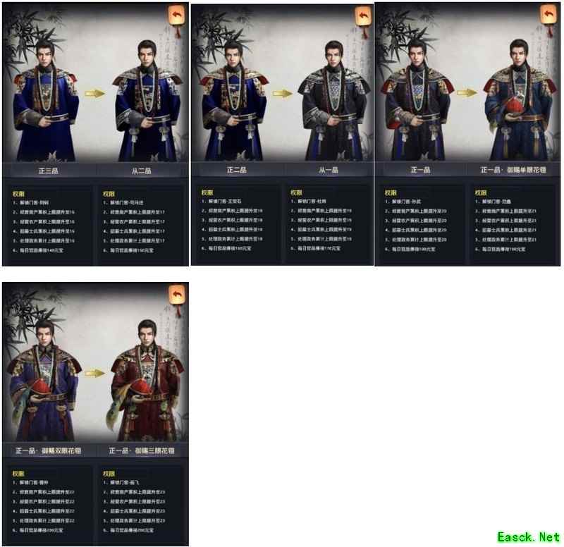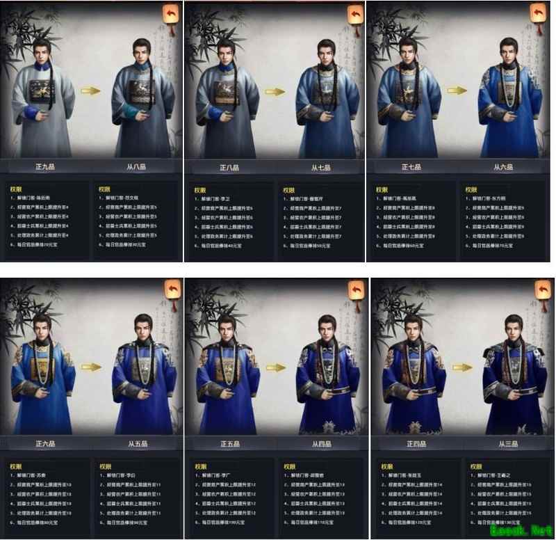 各位玩家朋友大家好,我是陪伴各位成长的助手官官。在游戏中,不同的官阶等级会带来相应的特权加成,官阶越高,参与翰林院、官府等玩法时的优势就越明显。平时各位要积极提升自己的官阶等级,相信不久之后就能一路高升。接下来官官就给大家详细讲解一下游戏中的官阶体系,一起来了解一下吧~ 游戏中设有21级官品体系,从从九品、正九品、从八品依次晋升,直至正一品。在正一品之上,还细分为单眼花翎、双眼花翎与三眼花翎三个等级。玩家通过积累政绩提升官阶,每升一级不仅可解锁相应门客,还能提高征收集结的次数上限,并增加每日俸禄所获得的元宝数量。此外,角色的官服外观也会随官品提升而发生变化。 不同官品对应专属官服、福利及可招募的门客,具体可在游戏内查看。愿各位大人官运亨通,步步高升。 以上内容仅供参考,具体情况以实际为准。