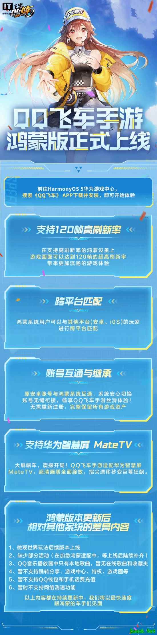 腾讯《QQ 飞车手游》官方宣布,《QQ 飞车手游》鸿蒙版将于 9 月 3 日上午 10:00 上线 HarmonyOS 5 华为游戏中心。官方称,原安卓账号与鸿蒙系统可轻松切换,所有游戏资产完整保留,全平台互通匹配。 在支持高刷新率的鸿蒙设备上,《QQ 飞车手游》的画面可以达到 120 帧的超高刷新率。鸿蒙版《QQ 飞车手游》还实现了跨平台匹配功能,玩家可以在鸿蒙系统与其他平台(如安卓、iOS)的玩家进行匹配对战。 鸿蒙版《QQ 飞车手游》还实现了账号互通与继承功能,原安卓账号与鸿蒙系统互通,玩家无需重新注册,即可无缝切换账号,完整保留玩家的所有游戏资产。 此外,鸿蒙版《QQ 飞车手游》还适配了华为智慧屏 MateTV,玩家可以在大屏上体验超清画质的全面绽放,享受指尖漂移秒变巨幕狂飙的震撼效果。 IT之家注意到,鸿蒙版《QQ 飞车手游》相对其他系统的版本也存在一些暂时的差异内容。例如,微观世界玩法将在后续版本上线,缺少部分活动(在加急适配中,等上线后陆续补齐),QQ 音乐播放器中只有本地歌曲,暂不支持跳转分享、游戏中心、特权、游戏圈等,暂不支持 QQ 钱包和手机话费充值,暂时不支持网络测速功能。腾讯游戏表示,以上内容都在持续更新中,将以最快速度跟鸿蒙的车手们见面。 更多相关资讯请关注:QQ飞车手游专区 |