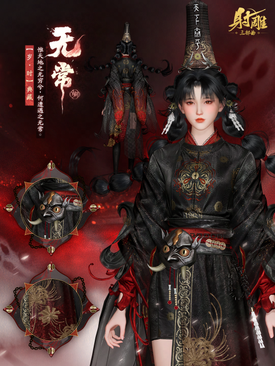 “七月十五日元夕,地官降下,定人间善恶”——《唐六典》所记的中元古俗,本是道教地官赦罪的斋醮之日,后与佛教盂兰盆会的典故交融,演变为 “焚纸钱、放河灯、祭鬼神”的民俗盛会,也就是我们今日所熟知的中元节。 一年一度的中元节即将悄然而至。宋代《岁时广记》曾载汴京中元节习俗:“市井卖冥器靴鞋,皆纸做而成”,《东京梦华录》中也曾描绘过 “鬼市” 盛景。《射雕》从各类典籍与民俗中取材,以传说中的黑白无常为灵感,为各位少侠带来了这套中元节限定外观【无常】,将千年民俗记忆,化作少侠们身上的衣冠。 【无常】将会在9月6日开放的节日活动玩法中免费获取,少侠们敬请期待! ![]() 男款取材于古代白无常“谢必安”的经典形象,融合了许多明清时期鬼神画像的视觉特征。素白广袖袍服采用渐变染色,走动时如魂魄飘曳,恰如《聊斋》中“鬼气凝而为形”的飘逸感。帽子上用墨笔写着“一见生财”四字,彰显白无常的身份。 ![]() 女款则取材于相对的黑无常“范无咎”。服饰以玄色漳缎为骨,裙摆做渐变效果。腰间锁链来自黑白无常勾魂索命的形象,帽上刻标志性 “天下太平”字样,帽下铜钱银铃吊坠轻响,暗合“无常至则铃声先闻” 的民俗记忆。 ![]() 无常 将近两千年前,张衡在《思玄赋》中曾有“唯天地之无穷兮,何遭遇之无常”的感叹。这套取材自黑白无常的外观,也处处体现着对传统民俗和民间传说故事的还原与用心。 ![]() ![]() 在细节上,两款外观均做了不少考究。以腰饰为例,腰上系挂着的铜钱,契合黑白无常在各类民间故事中“奖善摒恶,善者一见生财”的形象。而另一侧的无常面具和缠绕的锁链,恰如这对组合在传说中往往同时还扮演着索命钩魂,惩戒罪人的无情面貌。衣摆流动之间,是千年民俗里对善恶有报的敬畏。 ![]() 中元夜,无常至,这套凝结着民俗文化与现代美学的【无常】外观,既是对传统神祇形象的演绎,也是江湖儿女体验民俗传说的媒介。当少侠化作黑白无常,行走在《射雕》的世界里,或许能感受到那份 “善者见喜,恶者见惧” 的古老情感。 后续雕子仍将深耕文化主题外观,将更多历史典故与民间传说化作江湖华服。9月6日,少侠不妨于中元节的限定活动中留下身影,在活动中获取这套独特的外观—— 毕竟,这江湖最不缺的是故事,最难得的是有少侠愿以衣为媒,续写传说。 |