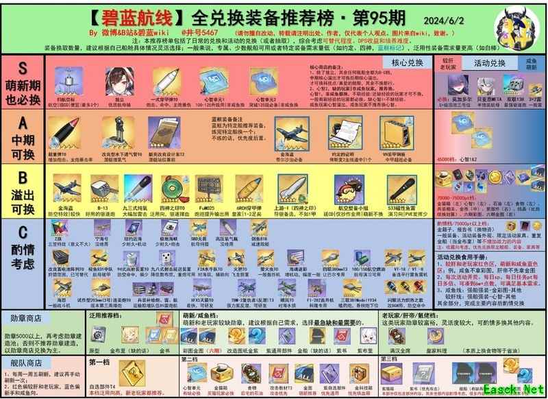 碧蓝航线周年庆活动已开启两周,本期兑换榜内容丰富,涵盖彩船、金船、强力装备等。本文整理自B站井号5467,结合各档位兑换建议,助你合理分配资源,高效提升战力。 周年庆活动已开启两周,现在来看看兑换榜吧,希望能为大家提供一些参考和帮助。 兑换榜95期 本期兑换内容丰富,包括彩船、金船、彩炮、金雷,总量远超常规活动。好在活动持续三周,难度适中,完成压力不大。 1、必换档。 双联138驱逐炮目前断档最强,必须更换。 莫加多尔是S+级顶尖攻击型三号位,可作为大世界炮队的强力先锋。建议优先兑换第一个,第二个可作为备用。大多数情况下,无需培养复制人。 如果你的PT只够换一个,优先选择200报告书,而非300个。 请注意,物资栏是用多余的PT或报告书换取物资,而不是用物资购买报告书,切勿误操作(具体兑换规则见第4条,需7万PT以上档)。 贝亚恩META作为半预装填航母,可在主线或大世界中作为备选舰船使用。 若已获得本体,切勿兑换8k本体,否则会变为价值2k的结晶;结晶在70000p以上档位可暂不兑换,详情请参考下方说明。 当前版本中,3+2金雷表现不错,但自律方面不敌磁雷,手操又略逊于岛风雷,整体性能稍弱于一阳指。如果不是追求收藏,可以不考虑更换。 在45000pt档位中,心智1和2的配置对部分资深玩家来说已出现资源溢出,尤其是持续投入的老玩家(如井鸽鸽心智1溢出近4万);而对于不追求120级船只的休闲玩家来说,溢出情况则更为明显。 新手或缺乏资源的指挥官建议更换,若老玩家无意培养更多120级科技船只,则优先级较低。 3、70000pt档,老几样。 值得一提的是,本次PT总量非常充足,还可以用额外PT兑换物资(请结合下文查看)。因此,请各位指挥官根据自身需求,合理取舍,放弃不需要的项目。例如: 专武兵装相关:若溢出或不再需要兵装,则不进行更换。 紫菜、可乐(后宅食物):如已溢出则不予更换,未溢出则必须更换。 科研图纸:若已毕业且为金船,可保留不换。 贝亚恩Meta结晶可在活动结束后于Meta商店兑换,需使用80个破碎结晶换取一个完整结晶。 活动结束后,1贝亚恩结晶可兑换80个破碎结晶,相当于2000积分,约等于13.3份报告书,价值不低于1333物资。 如果你认为用早已积累的80个破碎结晶,换取2000积分或1333物资并不划算,那么可以选择暂时不换,等到活动结束后再进行兑换。 唯一的不足是需等到6月20日后才能兑换,因此你只能延后满破她。若你的破碎结晶不会溢出,或打算兑换大量Meta技能书,则可不予考虑。 4、7Wpt以上档: 金箱子对非新手玩家来说意义不大,可视为非优先兑换选择。 报告书换取物资,请重点说明。 在7万至15万之间,可将pt替换为报告书,再转换成物资。 建议优先换取物资,确保物资充足后再考虑其他选项,避免资源浪费。 150PT可兑换1份报告书,1份报告书可兑换100物资,相当于3PT兑换2物资。 因此,请慎重考虑自己是否真的需要上一条中的物品。如果更急需物资,即使PT溢出,也不建议更换。 比如:1片紫菜相当于30PT或20物资;1个金箱等于300PT或200物资;1个兵装重构核心为2500PT或1667物资;1颗贝亚恩结晶则是2000PT或1333物资,以此类推。 如果你更需要物资,认为按上述比例用物资换取等式左边的内容不划算,就不建议兑换。 普通玩家换物资数量有限,兑换比例不高,实在不必为这点PT较劲。 5、活动刷法。 5.1关卡难度不高,挑战或普通模式均可参考井鸽鸽的攻略,拥有500心智时别忘了领取奖励。 本期SP消耗较低,难度不大,新彩驱逐炮让通关更轻松,可参考井鸽鸽的攻略。 只要你方中坚、Boss耗油能压至30以下,就值得挑战;本次甚至可用独角兽加彗星改或卡辛改,将油耗压至20以下。 本次活动新增了阿尔萨斯和彩驱逐炮双联138两项强化内容,低耗打法相比以往有所优化。 Z20凭借彩色驱逐炮进入低能耗顶级配置;阿尔萨斯则基本常年稳居顶配低耗跨服队。 C2进入三油高稳定时代,可参考顶配C2的三油作业方案,具体可查看井鸽鸽分享的相关内容。 B3依然采用3油高稳定性方案,具体可参考井鸽鸽分享的作业内容。 对于不想换后排的玩家,仍可用4油刷的老方法。 低耗模式中,+1油就能大幅降低难度,3油能打的关卡,4油萌新合理搭配也能轻松过关,5油装备随便配就能通关。 满队刷D图适合低配或不愿花时间刷装备的玩家。以下收益图可帮助选择收益较高的地图进行挑战。 |