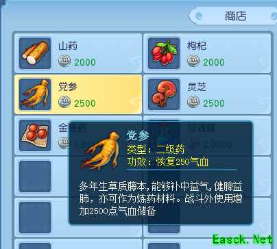《逍遥情缘》的少侠如果需要药品,又不准备花体力自己做的话,一般都是去寄售商城里购买成品药物的。不过并不是只有寄售商城里可以买到药品,别忘了长安城还有一个药坊呢!今天,我们来药坊老板这里看看他有什么独特的货吧。 【药店老板 独特货品】 药坊老板的位置很好找,就在地图正中央,仓库老板和商会总管的附近。药坊里卖的药品和寄售商城里是很不同的,寄售里的药品都是完全的制成品,而药坊这里却主要是纯天然药材。 【天然药材 物美价廉】 比如有可以入药也可以做菜的山药,战斗外使用后可以增加气血储备;还有中老年人喜欢用来泡茶的枸杞,战斗外使用后可以增加魔法储备。这些药材比起药品,或许效果更类似于菜肴了。 在这里,你还能买到别的地方买不到的灵芝和党参。这两样东西相当于山药和枸杞的上位替代,效果更加强力。此外,药坊这里还有金疮药和回魂露卖,都是值得一用的便宜药品哦! |