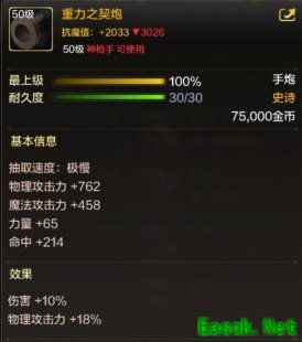 后面活动将赠送史诗武器跨界石,小号上的武器不要分解,没做魂武器的也可以再等等。 三、当前毕业装备武器 重力之契火炮力强,适合毕业首选。 重力契炮提升10%伤害,物理攻击增加18%,属性加成直接有效,面板数值出众,尤其适合当前版本,弥补了面板不足的问题,兼具输出与属性,是深渊战斗中的首选武器。