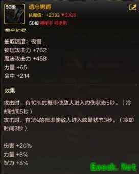 遗忘男爵-异常赋予,实力强劲。 攻击时有10%概率使敌人进入灼烧状态,持续5秒,并有3%概率附加3秒眩晕效果。力智提升8%,伤害增加20%。虽然属性加成优秀,但在爬塔等场景中仍建议优先选择重力炮。