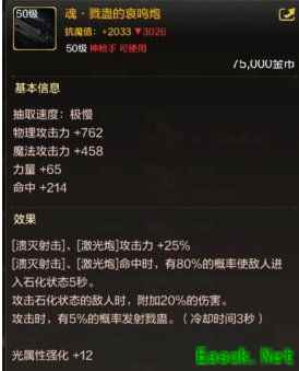 二、超强武器解析 魂虫王手炮为玩具武器,团本中实用性较低。 戮蛊的哀鸣炮获取难度较大,粉胚仅能通过特殊副本悲鸣洞穴获得,且掉落概率极低,建议有条件的玩家制作。该武器属性为光强+12,溃灭射击与激光炮攻击力提升25%,并且这两个技能有80%几率使敌人石化5秒。此效果在爬塔过程中作用显著,但团本和世界领主无法被石化,因此后期实用性较弱。