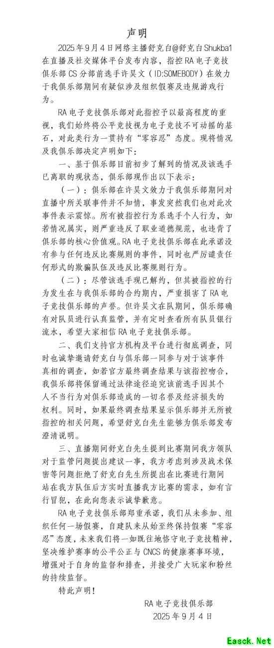 而被曝光涉嫌开挂的RA战队CS2分部也于昨晚发布声明,表示将对此事邀请官方和平台以及舒克白本人参与调查,绝不姑息。
