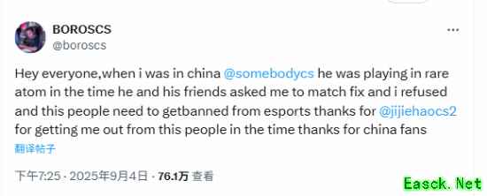 其中指出: C先生和Somebody长时间参与假赛组织,前者更是CS圈内头目级人士,在亚洲乃至国际赛场都有他开盘的比赛; 蒙古战队ATOX由C先生所有,而该战队在今年5月份因涉嫌参与非法投注而被禁赛处罚;
