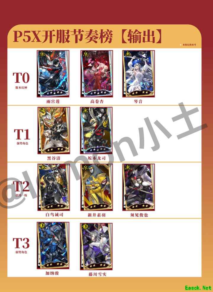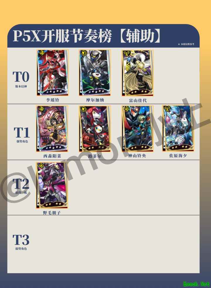 女神异闻录:夜幕魅影即将于4月12日全平台公测!作为P系列首款手游,延续了经典的卡牌回合与箱庭探索玩法,带来原汁原味的JRPG体验。本文为你盘点开服节奏榜,助你抽对幻神,开局遥遥领先! 作为女神异闻录系列首款手游,P5X旨在让更多玩家领略该IP的独特魅力。 本文为开服预热攻略,基于三次测试体验整理,仅供参考。 公测时间定于4月12日 女神异闻录:夜幕魅影将在2024年4月12日正式开启全平台公测。游戏延续了P系列的经典设计风格,前期体验十分吸引人,越深入游玩越令人沉浸其中,难以自拔。 回合制卡牌玩法,融合IP改编与日式RPG元素,打造精致箱庭世界。 P5X采用箱庭式探索玩法,美术风格贴近原作,还原度极高。 地图中设有宝箱和收集物品,达成满成就的探索奖励十分丰厚。游戏前期需要大量投入时间,探索任务较为繁重。 ?游戏亮点: 独特迷人的Citypop曲风 精彩呈现爵士乐风格音乐 沉浸式日式角色扮演剧情体验 玩法优点: 主打游玩定位,内容丰富,可玩半个月。 当下流行的艺术风格 日常模块内容丰富多彩 独特的COOP恋爱培养系统 玩法缺点: 米氏氪金法则调整为0.8%概率,80次小保底机制。 有工会战和深渊活动。 福利普通,氪金压力偏高。 等级限制过多,明显阻碍进度,大幅降低地图探索体验。 专武需抽卡获取,绑定特定角色,无法通用,包括低星武器也无法共用。 保留原始风格的圣遗物系统 推荐初始角色选择 玩过本家游戏的都知道,女神异闻录中存在大量属性克制、反弹和无效化的设定,因此没有任何一种输出方式是绝对稳定的。 ①JOKER【SSR|限定UP池】 本家人气角色,三测中输出爆表,极可能遭削弱。拥有再动机制,面板数值顶尖,若未被砍,预计将成为公测必抽的人权卡。 富山佳代SR卡,免费教程赠送。 人妻辣妹是外网上讨论度最高的角色,也是第三次测试中最实用的辅助角色。她既能提升攻击力,又能提供护盾和增伤效果,输出越高,带来的增益越强。非常适合用于刷高分,而且作为新手教程中免费赠送的角色,每个玩家都能轻松获得。 佐仓双叶为SSR级后期角色。 该角色属于本家系列,定位为对策型辅助,技能机制与崩铁中的银狼类似,能够为敌人附加弱点标记,提升队伍在爆发回合的输出效果。在P5系统中,游戏机制非常注重弱点克制,因此该角色在辅助能力上表现突出,堪称顶级辅助之一,拥有极高价值。不过前期作用相对有限,需在后期将技能与攻击力提升至较高水平,配合强力主C才能发挥真正实力,尤其擅长应对无属性弱点的敌人,属于大后期强势角色。 ④李瑶铃【SSR】 |4月9号更新 | 根据前瞻直播的实机内容进行调整,移除了部分公测尚未上线的角色。 |