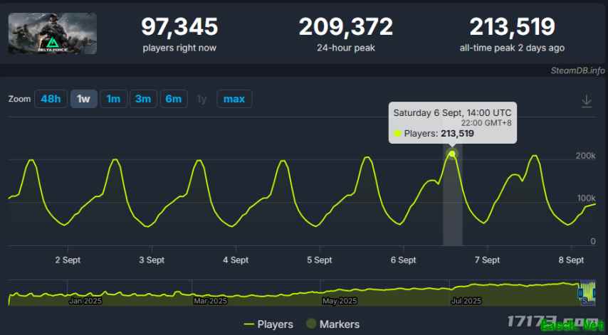现象级射击网游《三角洲行动》在近日迎来历史性时刻。根据SteamDB最新数据,该游戏于9月6日创下213,519人同时在线的峰值纪录,刷新了自身保持的历史最高在线人数,这也是其在三个月内第三次打破该记录。 此次突破标志着《三角洲行动》自登陆主机平台后的持续爆发。尽管游戏最近一次大型更新——第五赛季“风暴之眼”已于7月中旬上线,但本次人气飙升主要得益于PS5、Xbox Series X/S版本的推出,以及PC与主机间完全跨平台的联机功能。这一举措极大扩展了玩家基础,形成了强大的协同效应,成功反哺PC端活跃度。 值得注意的是,此前的在线峰值为8月25日的210,413人,而如今的新纪录再次证明了其用户增长的强劲势头。作为腾讯天美工作室重点打造的战术射击IP,《三角洲行动》凭借高质量的画面表现、快节奏的战斗体验以及持续优化的跨平台生态,正迅速成为全球玩家关注的焦点。 为延续这一上升趋势,官方已公布下一阶段更新计划:第六赛季“烈火冲天”将于9月17日正式上线,届时将推出全新作战地图“断层”、多款新武器,并有望引入空中载具F-45A战斗机,进一步丰富战场维度。 与此同时,电竞赛事布局也在加速推进。2025《三角洲行动》国际邀请赛将于9月19日至21日举行,来自全球8个赛区的12支顶尖战队将齐聚一堂,争夺赛事历史上首个世界冠军头衔,届时必将再次掀起新一轮玩家热潮。 随着内容更新与赛事活动的密集推进,《三角洲行动》有望在2025年下半年持续领跑免费射击游戏市场。 |